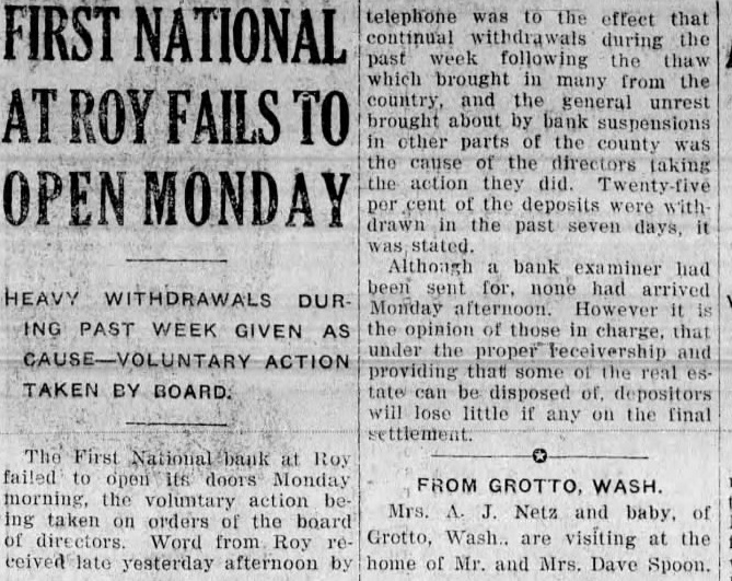 FIRST NATIONAL AT ROY FAILS TO OPEN MONDAY HEAVY WITHDRAWALS DURING PAST WEEK GIVEN AS CAUSE-VOLUNTARY ACTION TAKEN BY BOARD. The First National bank at Roy failed to open doors Monday morning, the voluntary action being taken on orders of the board of directors. Word from Roy received late yesterday afternoon by telephone was to the effect that continual withdrawals during the past week followin the thaw which brought in many from the country, and the general unrest brought about by bank suspensions in other parts of the county was the cause of the directors taking the action they did. Twenty-five per cent of the deposits were with drawn in the past seven days, it stated. Although a bank examiner had been sent for, none had arrived Monday afternoon. However it the opinion of those in charge, that under the proper" receivership and providing that some or the real estate can be disposed of, depositors will lose little if any on the final FROM GROTTO, WASH. Mrs. A. J. Netz and baby. of Grotto, Wash.. are visiting at the home of Mr. and Mrs. Dave Spoon.