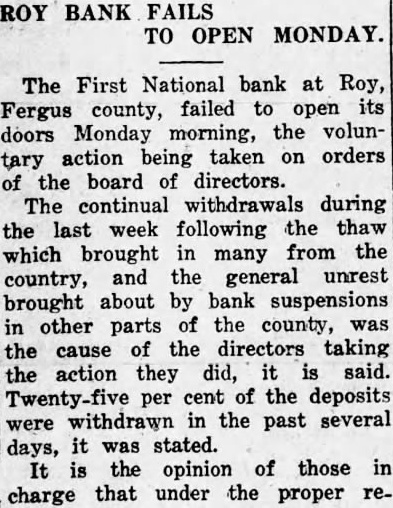 ROY BANK FAILS TO OPEN MONDAY. The First National bank at Roy, Fergus county, failed to open its doors Monday morning, the voluntary action being taken on orders of the board of directors. The continual withdrawals during the last week following the thaw which brought in many from the country, and the general unrest brought about by bank suspensions in other parts of the county, was the cause of the directors taking the action they did, it is said. Twenty-five per cent of the deposits were withdrawn in the past several days, it was stated. It is the opinion of those in charge that under the proper re-
