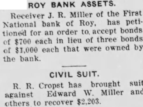 ROY BANK ASSETS. Receiver J. R. Miller of the First National bank of Roy, has petitioned for an order to, accept bonds of $700 each in lieu of three bonds of $1,000 each that were owned by the bank. CIVIL SUIT. R. R. Cropst has brought suit against Edward W. Miller and others to recover $2,203.