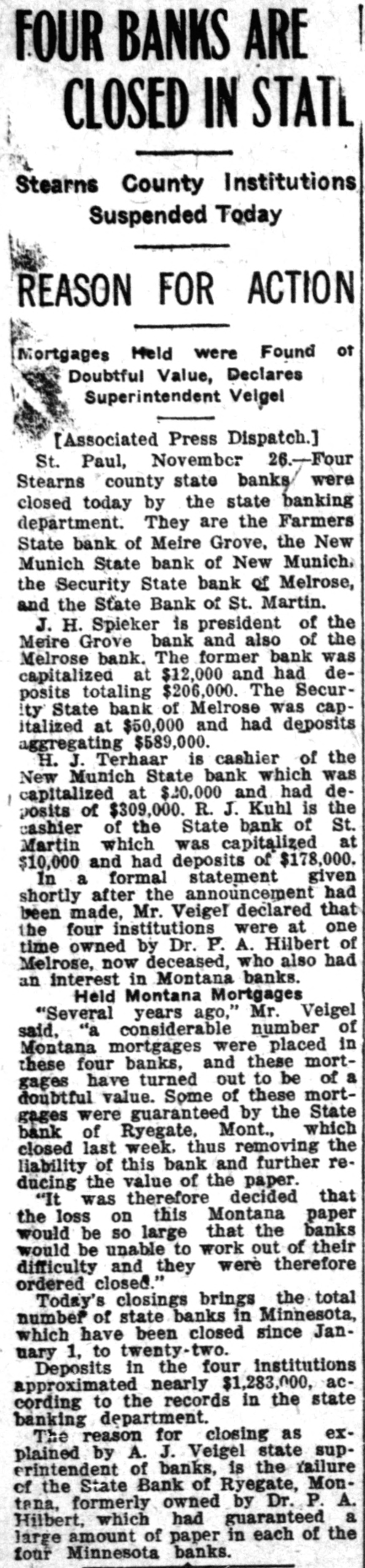 FOUR BANKS ARE CLOSED IN STATL Stearns County Institutions Suspended Today REASON FOR ACTION Mortgages Held were Found of Doubtful Value, Declares Superintendent Veigel [Associated Press Dispatch.] St. Paul, November 26.-Four Stearns county state banks were closed today by the state banking department. They are the Farmers State bank of Meire Grove, the New Munich State bank of New Munich, the Security State bank of Melrose, and the State Bank of St. Martin. J. H. Spieker is president of the Meire Grove bank and also of the Melrose bank. The former bank was capitalized at $12,000 and had deposits totaling $206,000. The Security State bank of Melrose was capitalized at $50,000 and had deposits aggregating $589,000. H. J. Terhaar is cashier of the New Munich State bank which was capitalized at $20,000 and had deposits of $309,000. R. J. Kuhl is the cashier of the State bank of St. Martin which was capitalized at $10,000 and had deposits of $178,000. In a formal statement given shortly after the announcement had been made, Mr. Veigel declared that the four institutions were at one time owned by Dr. P. A. Hilbert of Melrose, now deceased, who also had an interest in Montana banks. Held Montana Mortgages "Several years ago," Mr. Veigel said, "a considerable number of Montana mortgages were placed in these four banks, and these mortgages have turned out to be of a doubtful value. Some of these mortgages were guaranteed by the State bank of Ryegate, Mont., which closed last week. thus removing the liability of this bank and further reducing the value of the paper. "It was therefore decided that the loss on this Montana paper would be so large that the banks would be unable to work out of their difficulty and they were therefore ordered closed." Today's closings brings the total number of state banks in Minnesota, which have been closed since January 1, to twenty-two. Deposits in the four institutions approximated nearly $1,283,000, according to the records in the state banking department. The reason for closing as explained by A. J. Veigel state superintendent of banks, is the failure of the State Bank of Ryegate, Montana, formerly owned by Dr. P. A. Hilbert, which had guaranteed a large amount of paper in each of the four Minnesota banks.