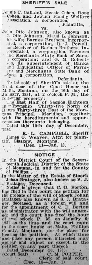 SHERIFF'S SALE Jennie Galland, Bessie Cohen, Rose Cohen, and Family Welfare Association, a corporation, Plaintiffs, Otto Johnson, also known as Otto Johnson, Maud Johnson, his wife; Barnes Brothers, Receiver Barnes In and Merchants Saco, and RobertLiquidating Officer Banks Farmand Merchants State Bank of Saco, a corporation, sold at Sheriff's Defendants. the the House 10th January, 1931, M., the property: Seption Eighteen Township North Range three East the Principal Meridian, together the and appurtenances Dated this 10th day December, 1930. CAMPBELL Sheriff James for plainGlasgow, Montana. (Dec. 11-Jan. 1). NOTICE In the District of the SevenJudicial State of Montana, in and for the County In of the Estate of Stoerk S. Bratager, Deceased. that D. Borton, has filed in his for probate the will Johan also as deceased, as the Borton the will and the has fixed January 1931 house the place hearing the time interested appear and object except to the any (Court PORTER Clerk said court.