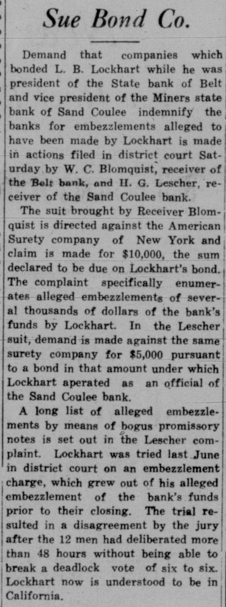 Sue Bond Co. Demand that companies which bonded L. B. Lockhart while he was president of the State bank of Belt and vice president of the Miners state bank of Sand Coulee indemnify the banks for embezzlements alleged to have been made by Lockhart is made in actions filed in district court Saturday by W. C. Blomquist, receiver of the Belt bank, and H. G. Lescher, receiver of the Sand Coulee bank. The suit brought by Receiver Blomquist is directed against the American Surety company of New York and claim is made for $10,000, the sum declared to be due on Lockhart's bond. The complaint specifically enumerates alleged embezzlements of several thousands of dollars of the bank's funds by Lockhart. In the Lescher suit, demand is made against the same surety company for $5,000 pursuant to a bond in that amount under which Lockhart aperated as an official of the Sand Coulee bank. A long list of alleged embezzlements by means of bogus promissory notes is set out in the Lescher complaint. Lockhart was tried last June in district court on an embezzlement charge, which grew out of his alleged embezzlement of the bank's funds prior to their closing. The trial resulted in a disagreement by the jury after the 12 men had deliberated more than 48 hours without being able to break a deadlock vote of six to six. Lockhart now is understood to be in California.