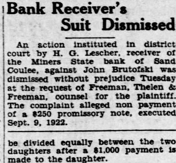 Bank Receiver's Suit Dismissed An action instituted in district court by H. G. Lescher, receiver of the Miners State bank of Sand Coulee, against John Brutofski was dismissed without prejudice Tuesday at the request of Freeman, Thelen & Freeman, counsel for the plaintiff. The complaint alleged non payment of 8250 promissory note, executed Sept. 9, 1922. be divided equally between the two daughters after $1,000 payment is made to the daughter.