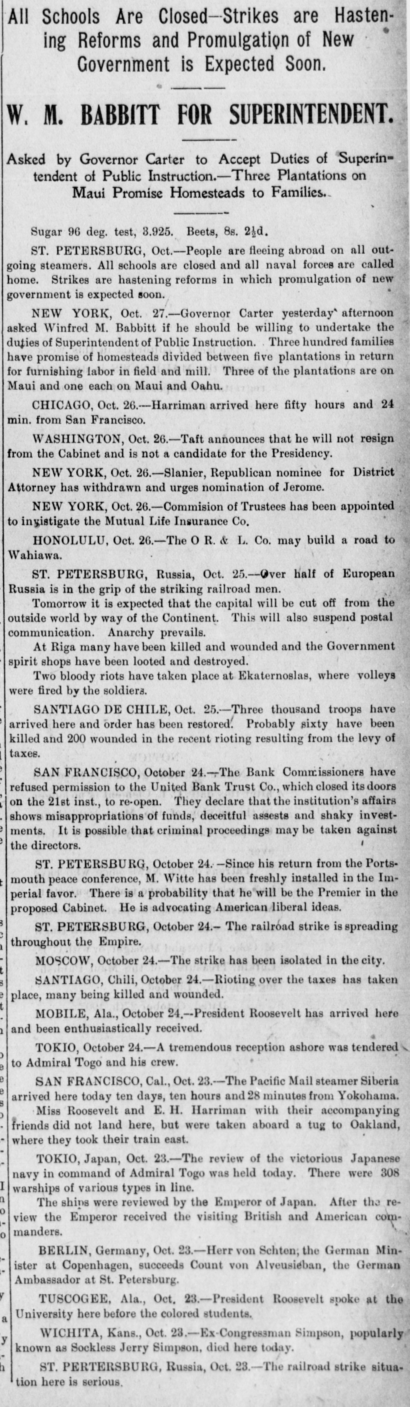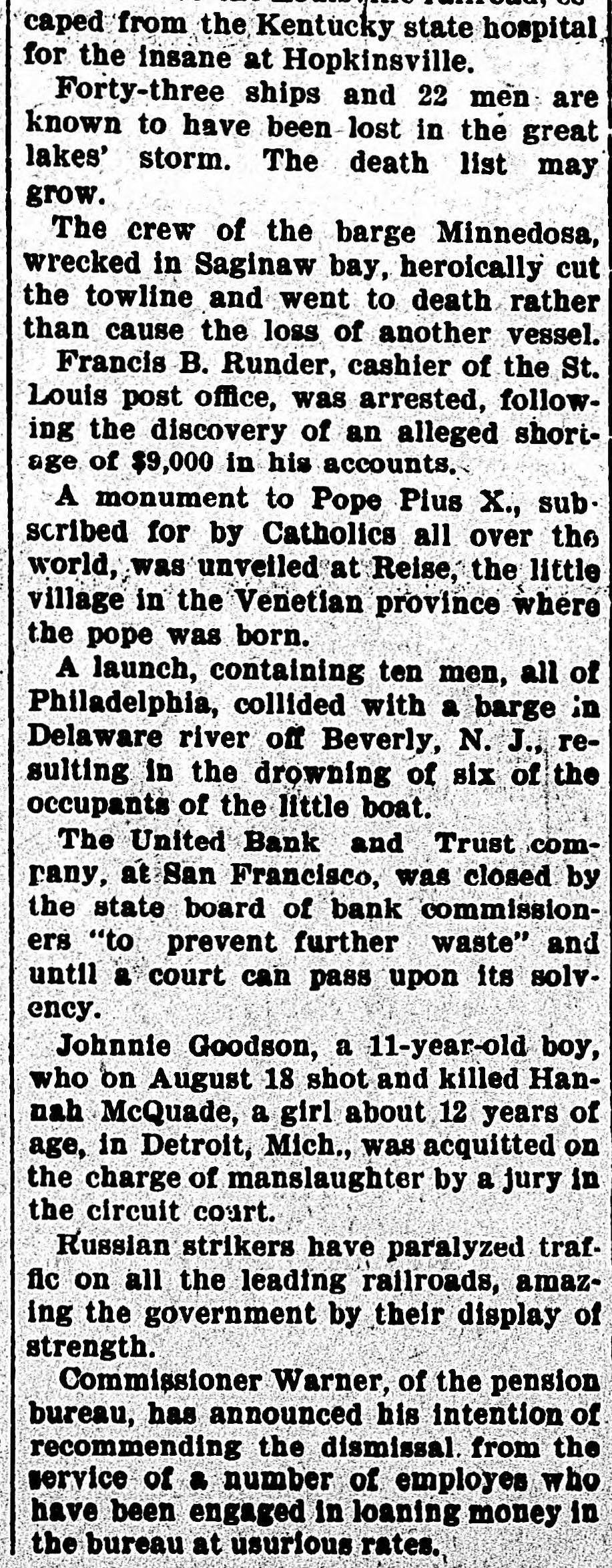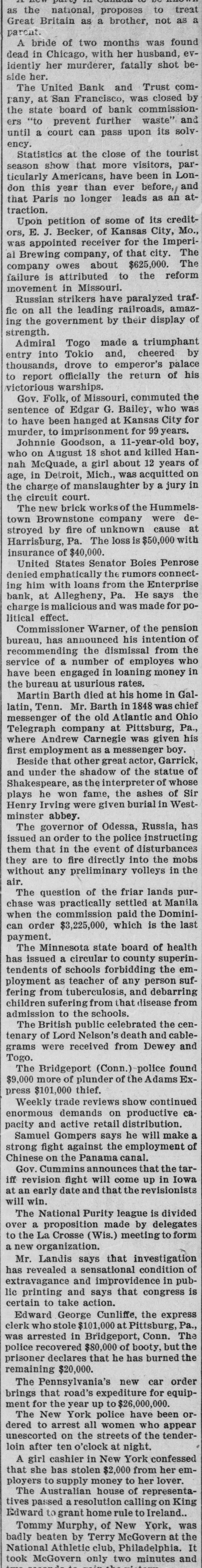 an TTT faind as the national, proposes to treat Great Britain as a brother, not as a parent. A bride of two months was found dead in Chicago, with her husband, evidently her murderer, fatally shot beside her. The United Bank and Trust company, at San Francisco, was closed by the state board of bank commissioners "to prevent further waste" and until a court can pass upon its solvency. Statistics at the close of the tourist season show that more visitors, particularly Americans, have been in London this year than ever before, and that Paris no longer leads as an attraction. Upon petition of some of its creditors, E. J. Becker, of Kansas City, Mo., was appointed receiver for the Imperial Brewing company, of that city. The company owes about $625,000. The failure is attributed to the reform movement in Missouri. Russian strikers have paralyzed traffic on all the leading railroads, amazing the government by their display of strength. Admiral Togo made a triumphant entry into Tokio and, cheered by thousands, drove to emperor's palace to report officially the return of his victorious warships. Gov. Folk, of Missouri, commuted the sentence of Edgar G. Bailey, who was to have been hanged at Kansas City for murder, to imprisonment for 99 years. Johnnie Goodson, a 11-year-old boy, who on August 18 shot and killed Hannah McQuade, a girl about 12 years of age, in Detroit, Mich., was acquitted on the charge of manslaughter by a jury in the circuit court. The new brick worksof the Hummelstown Brownstone company were destroyed by fire of unknown cause at Harrisburg, Pa. The loss is $50,000 with insurance of $40,000. United States Senator Boies Penrose denied emphatically the rumors connecting him with loans from the Enterprise bank, at Allegheny, Pa. He says the charge is malicious and was made for political effect. Commissioner Warner, of the pension bureau, has announced his intention of recommending the dismissal from the service of a number of employes who have been engaged in loaning money in the bureau at usurious rates. Martin Barth died at his home in Gallatin, Tenn. Mr. Barth in 1848 was chief messenger of the old Atlantic and Ohio Telegraph company at Pittsburg, Pa., where Andrew Carnegie was given his first employment as a messenger boy. Beside that other great actor, Garrick, and under the shadow of the statue of Shakespeare, as the interpreter of whose plays he won fame, the ashes of Sir Henry Irving were given burial in Westminster abbey. The governor of Odessa, Russia, has issued an order to the police instructing them that in the event of disturbances they are to fire directly into the mobs without any preliminary volleys in the air. The question of the friar lands purchase was practically settled at Manila when the commission paid the Dominican order $3,225,000, which is the last payment. The Minnesota state board of health has issued a circular to county superintendents of schools forbidding the employment as teacher of any person suffering from tuberculosis, and debarring children sufering from that disease from admission to the schools. The British public celebrated the centenary of Lord Nelson's death and cablegrams were received from Dewey and Togo. The Bridgeport (Conn.) -police found $9,000 more of plunder of the Adams Express $101,000 thief. Weekly trade reviews show continued enormous demands on productive capacity and active retail distribution. Samuel Gompers says he will make a strong fight against the employment of Chinese on the Panama canal. Gov. Cummins announces that the tariff revision fight will come up in Iowa at an early date and that the revisionists will win. The National Purity league is divided over a proposition made by delegates to the La Crosse (Wis.) meeting to form a new organization. Mr. Landis says that investigation has revealed a sensational condition of extravagance and improvidence in public printing and says that congress is certain to take action. Edward George Cunliffe, the express clerk who stole $101,000 at Pittsburg, Pa., was arrested in Bridgeport, Conn. The police recovered $80,000 of booty, but the prisoner declares that he has burned the remaining $20,000. The Pennsylvania's new car order brings that road's expediture for equipment for the year up to $26,000,000. The New York police have been or-