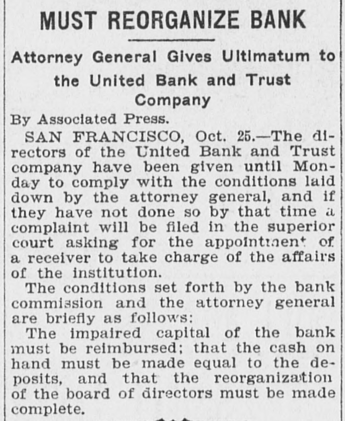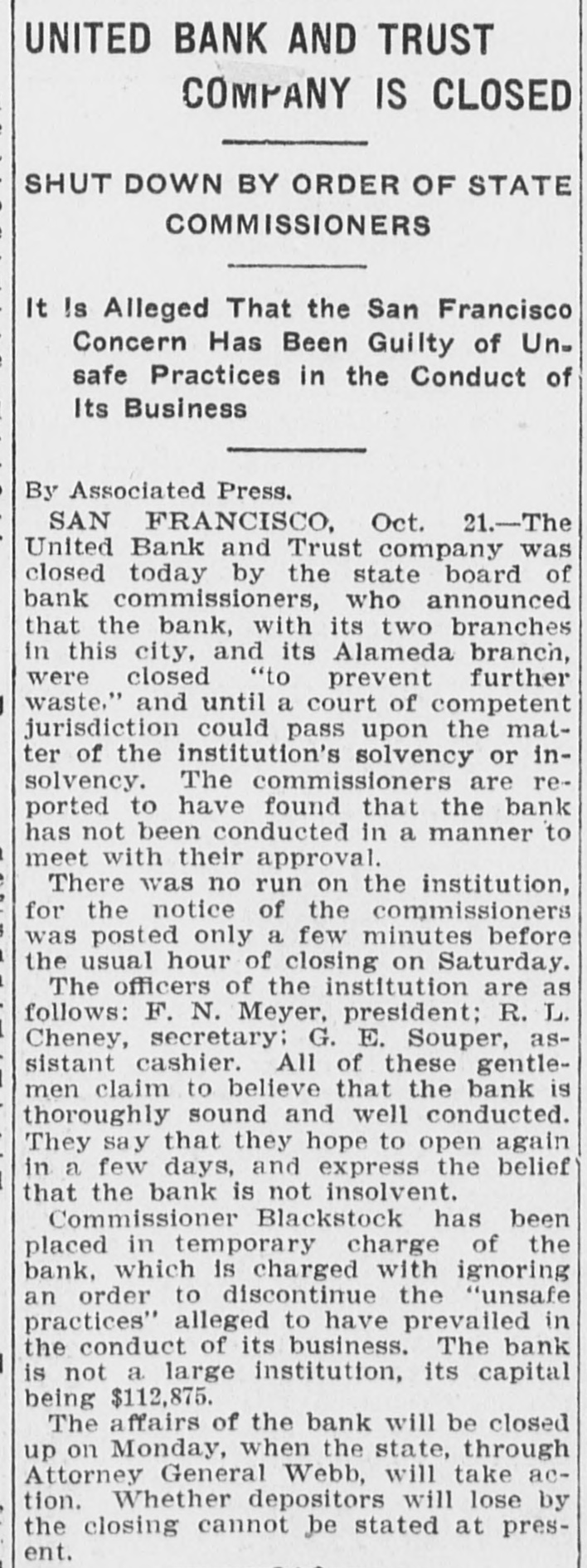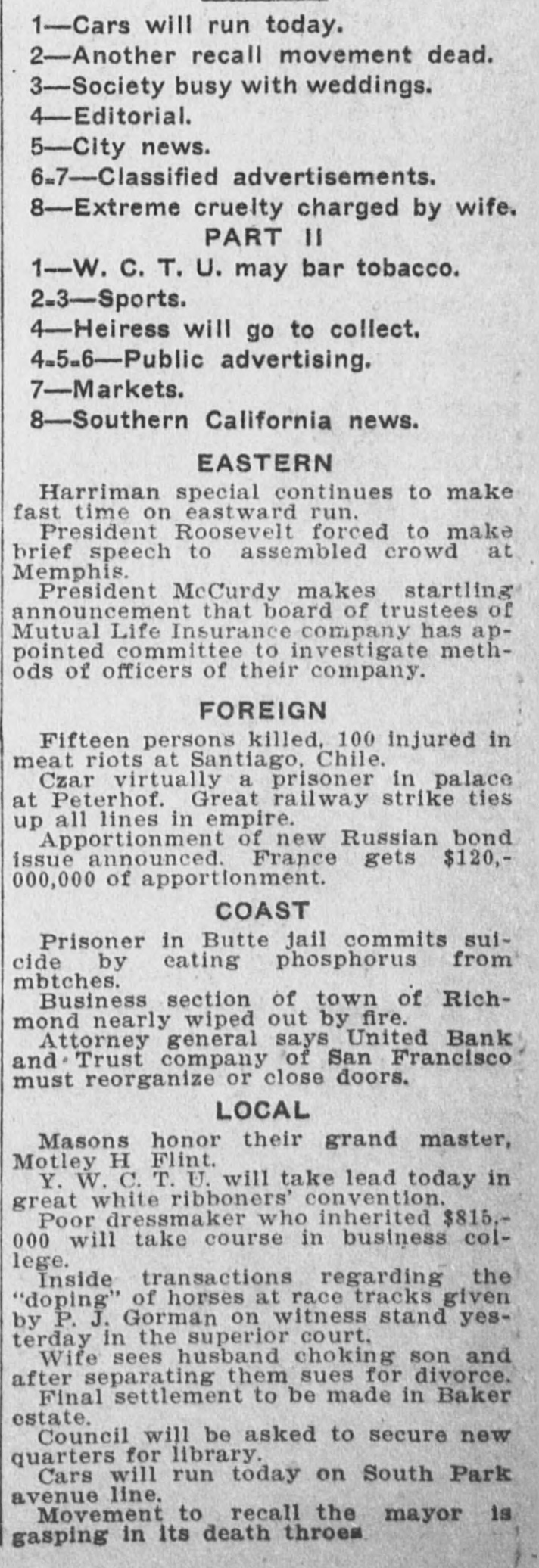 an TTT faind as the national, proposes to treat Great Britain as a brother, not as a parent. A bride of two months was found dead in Chicago, with her husband, evidently her murderer, fatally shot beside her. The United Bank and Trust company, at San Francisco, was closed by the state board of bank commissioners "to prevent further waste" and until a court can pass upon its solvency. Statistics at the close of the tourist season show that more visitors, particularly Americans, have been in London this year than ever before, and that Paris no longer leads as an attraction. Upon petition of some of its creditors, E. J. Becker, of Kansas City, Mo., was appointed receiver for the Imperial Brewing company, of that city. The company owes about $625,000. The failure is attributed to the reform movement in Missouri. Russian strikers have paralyzed traffic on all the leading railroads, amazing the government by their display of strength. Admiral Togo made a triumphant entry into Tokio and, cheered by thousands, drove to emperor's palace to report officially the return of his victorious warships. Gov. Folk, of Missouri, commuted the sentence of Edgar G. Bailey, who was to have been hanged at Kansas City for murder, to imprisonment for 99 years. Johnnie Goodson, a 11-year-old boy, who on August 18 shot and killed Hannah McQuade, a girl about 12 years of age, in Detroit, Mich., was acquitted on the charge of manslaughter by a jury in the circuit court. The new brick worksof the Hummelstown Brownstone company were destroyed by fire of unknown cause at Harrisburg, Pa. The loss is $50,000 with insurance of $40,000. United States Senator Boies Penrose denied emphatically the rumors connecting him with loans from the Enterprise bank, at Allegheny, Pa. He says the charge is malicious and was made for political effect. Commissioner Warner, of the pension bureau, has announced his intention of recommending the dismissal from the service of a number of employes who have been engaged in loaning money in the bureau at usurious rates. Martin Barth died at his home in Gallatin, Tenn. Mr. Barth in 1848 was chief messenger of the old Atlantic and Ohio Telegraph company at Pittsburg, Pa., where Andrew Carnegie was given his first employment as a messenger boy. Beside that other great actor, Garrick, and under the shadow of the statue of Shakespeare, as the interpreter of whose plays he won fame, the ashes of Sir Henry Irving were given burial in Westminster abbey. The governor of Odessa, Russia, has issued an order to the police instructing them that in the event of disturbances they are to fire directly into the mobs without any preliminary volleys in the air. The question of the friar lands purchase was practically settled at Manila when the commission paid the Dominican order $3,225,000, which is the last payment. The Minnesota state board of health has issued a circular to county superintendents of schools forbidding the employment as teacher of any person suffering from tuberculosis, and debarring children sufering from that disease from admission to the schools. The British public celebrated the centenary of Lord Nelson's death and cablegrams were received from Dewey and Togo. The Bridgeport (Conn.) -police found $9,000 more of plunder of the Adams Express $101,000 thief. Weekly trade reviews show continued enormous demands on productive capacity and active retail distribution. Samuel Gompers says he will make a strong fight against the employment of Chinese on the Panama canal. Gov. Cummins announces that the tariff revision fight will come up in Iowa at an early date and that the revisionists will win. The National Purity league is divided over a proposition made by delegates to the La Crosse (Wis.) meeting to form a new organization. Mr. Landis says that investigation has revealed a sensational condition of extravagance and improvidence in public printing and says that congress is certain to take action. Edward George Cunliffe, the express clerk who stole $101,000 at Pittsburg, Pa., was arrested in Bridgeport, Conn. The police recovered $80,000 of booty, but the prisoner declares that he has burned the remaining $20,000. The Pennsylvania's new car order brings that road's expediture for equipment for the year up to $26,000,000. The New York police have been or-