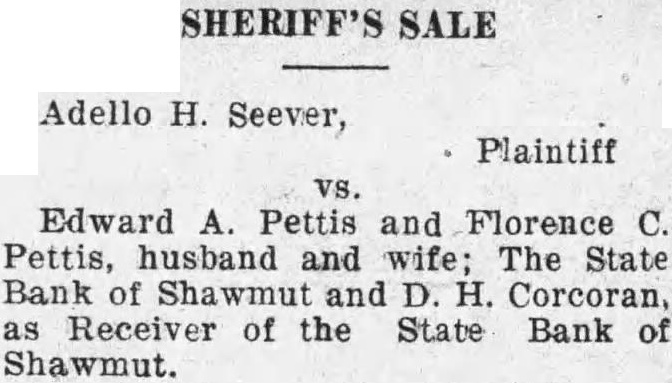 Edward A. Pettis and Florence C. Pettis, husband and wife: The State Bank of Shawmut and D. H. Corcoran, as Receiver of the State Bank of Shawmut.