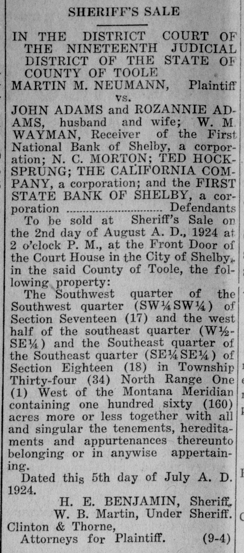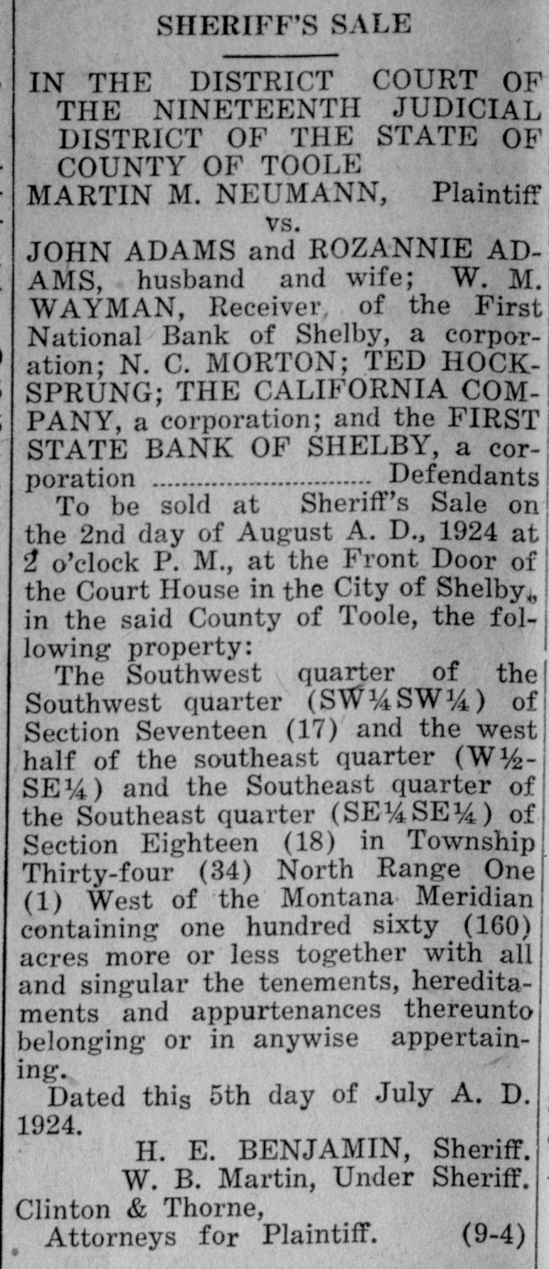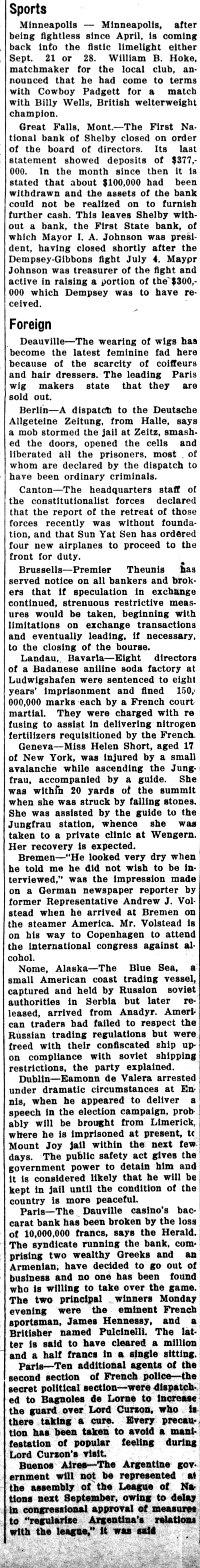 Condensed Resume of the Important Events in the Nation and State. Sports Minneapolis - Minneapolis, after IMPORTANT being fightless since April, is coming back into the fistic limelight either Sept. 21 or 28. William B. Hoke, OF WORLD matchmaker for the local club, an nounced that he had come to terms openings of the Week with Cowboy Padgett for a match for the Benefit of with Billy Wells, British welterweight champion. Readers Busy Philadelphia-Luis Firpo, the South American giant, knocked out Charles Weinert, veteran Newark, N. J., to situation heavyweight, in the second round of gton-Mexican cabinet. a scheduled eight round bout at the National league baseball park before gton-Mrs. Harding to leave at home and more than 30,000 fans. Weinert was make Edof floored four times before his seconds residence suburban leaped into the ring and the referee McLean, near Washington. General stopped counting. Weinert weighed Attorney 188; Firpo, 212. Just before entering after conference with presthe ring Firpo declared that reports government will not Pain Southern decision that he was anxious to postpone his Pacific case. bout with Jack Dempsey were exagC. State of gerated. The Argentinan admitted, ton-Secretary however, that he would rather have confers with General owder and asks Cuban conanother year's experience before tackling the champion. action on legislation to interGreat Falls, Mont.-The First NaAmerican njurious tional bank of Shelby closed on order of the board of directors. Its last Veterans' bureau the director the of statement showed deposits of $377,budget 000. In the month since then it is the 12 month period bestated that about $100,000 had been July 1, it will be able to withdrawn and the assets of the bank its various activities with could not be realized on to furnish of $25,500,000 less further cash. This leaves Shelby with $467,000,000 appropriation out a bank, the First State bank, of the current fiscal year. which Mayor I. A. Johnson was presiton-The federal governanthracite to an avert dent, having closed shortly after the of Dempsey-Gibbons fight July 4. Mayor inviting representatives to conminers and Johnson was treasurer of the fight and perators imhere commission coal active in raising a portion of the $300,000 which Dempsey was to have re A telegram conveying the ceived. to both sides went forward. ofcommission coal by Foreign they had conferred with Deauville-The wearing of wigs has Coolidge. become the latest feminine fad here ton-Negotiations between because of the scarcity of coiffeurs States and Mexico, lookand hair dressers. The leading Paris recognition of the Obregon wig makers state that they are are approaching an end, sold out. of the results attained will Berlin-A dispatch to the Deutsche until John Barton Payne Allgeteine Zeitung, from Halle, says B. Warren, the American a mob stormed the jail at Zeitz, smashreturn to Washington ed the doors, opened the cells and City, it was announced liberated all the prisoners, most of department. whom are declared by the dispatch to ,ton-Requirements of the have been ordinary criminals. are the at juncture present Canton-The headquarters staff of President Coolidge does the constitutionalist forces declared to leave Washington this that the report of the retreat of those inthe vacation resume forces recently was without foundaby the death of President tion, and that Sun Yat Sen has ordered He recognizes, it was said, four new airplanes to proceed to the are many details of the offront for duty. he is unfamiliar. The Brussells-Premier Theunis has to become acquainted served notice on all bankers and brokhe feels, is by staying here. ers that if speculation in exchange ton-The blooded riding continued, strenuous restrictive meassented to President Harding ures would be taken, beginning with be will Firestone S. soon limitations on exchange transactions Mr. Firestone's stables in and eventually leading, if necessary, Harbel, was Mr. Hardto the closing of the bourse. two weeks several for Landau, Bavaria-Eight directors advice his of when on phyof a Badanese aniline soda factory at took up horseback riding. Ludwigshafen were sentenced to eight up riding in favor of years' imprisonment and fined 150,he entered Harbell in 000,000 marks each by a French courtshows and won prizes. martial. They were charged with refusing to assist in delivering nitrogen fertilizers requisitioned by the French. state convenWash.-The Geneva-Miss Helen Short, aged 17, adopted a resolution to of New York, was injured by a small of Warren G. Harding avalanche while ascending the Jung Washin of lodge every frau, accompanied by a guide. She was within 20 yards of the summit Kan.-Thirty-five persons when she was struck by falling stones. three and severely, She was assisted by the guide to the of dollars damage was done Jungfrau station, whence she was that almost wiped out taken to a private clinic at Wengern. of 400 inhabitants, 35 Her recovery is expected. here. of Bremen-"He looked very dry when Vt.-Park H. Pollard, a he told me he did not wish to be in of President Coolidge, terviewed," was the impression made indorsed by the democratic on a German newspaper reporter by as the party candidate former Representative Andrew J. Vol to succeed the late Senastead when he arrived at Bremen on P. Dillingham, has been the steamer America. Mr. Volstead is of the state committee since on his way to Copenhagen to attend merchant in Proctorsis a the international congress against alcohol. Kan.-The Kansas House Nome, Alaska-The Blue Sea, a take up the bill appropriatsmall American coast trading vessel, bonds additional to captured and held by Russion soviet shortage in the bonus fund, authorities in Serbia but later rereceipt of more detailed released, arrived from Anadyr. Ameridirector bonus and the can traders had failed to respect the as to just what the shortRussian trading regulations but were The Senate passed the freed with their confiscated ship up
