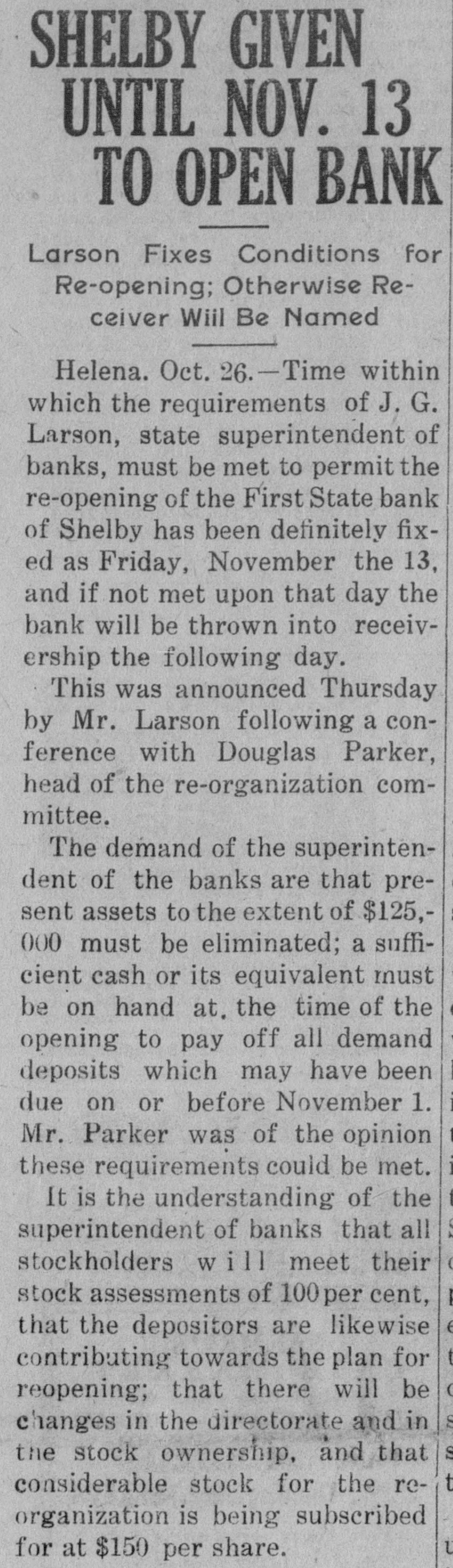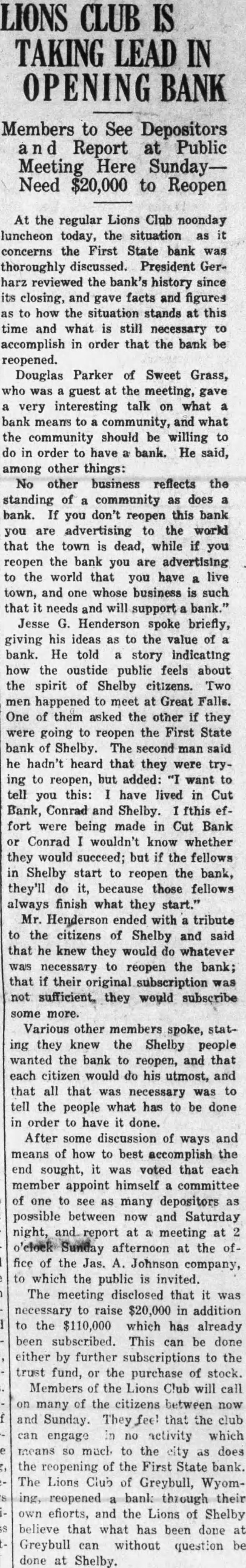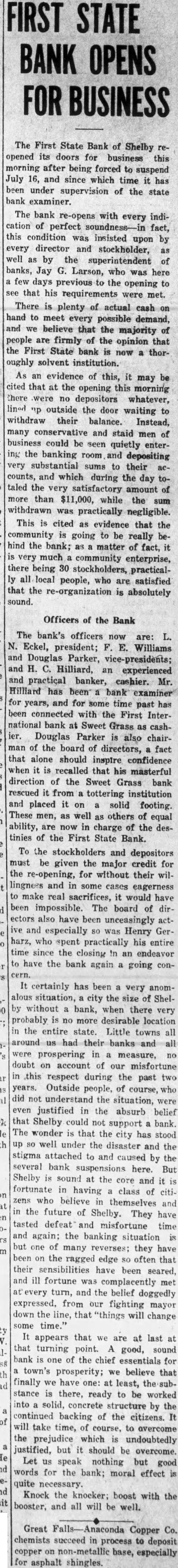 The bank's officers now are: Eckel, president; Williams Douglas Parker, Hilliard, experienced and practical banker, Mr. cashier. Hilliard has been bank for and for years, some time past been connected with the First International bank Sweet Grass cashDouglas Parker also chairof the board of directors, fact that alone should inspire confidence recalled that his masterful direction of the Sweet Grass bank rescued from tottering institution and placed solid footing. These men, well others of equal ability, are now in charge of the destinies of the First State Bank. To the stockholders and depositors given the major credit for the re-opening, for without their willingness and in some cases eagerness real sacrifices, would have been impossible. The board of ectors also have been unceasingly active and especially Gerwas Henry harz, who spent practically his entire time since the closing in endeavor to have the bank again going certainly has been very alous situation, city the size Shelwithout bank, when there very probably no more desirable location the entire state. Little towns all prospering measure, doubt on account of our misfortune this respect during the past years. Outside people, of not understand the situation, justified in the absurb belief that Shelby could not support bank. The wonder that the city has stood well under the disaster and the stigma attached and caused by the several bank here. But Shelby sound core and fortunate having class of who believe themselves the future Shelby. They have tasted defeat and misfortune time again; the banking situation many they have been the ragged edge often that their sensibilities have been seared, and fortune was complacently turn, and the belief doggedly expressed, from fighting mayor down the that "things will change appears that are at last that turning point. sound good, bank is of the chief essentials for town's prosperity; believe that finally have one: least, stance there, ready to be worked solid, concrete structure the continued backing of the citizens. take time, to course, overcome the prejudice which undoubtedly justified, but should be overcome. Let speak nothing but good words for the bank; moral effect quite necessary. Knock the knocker; boost with the booster, and all