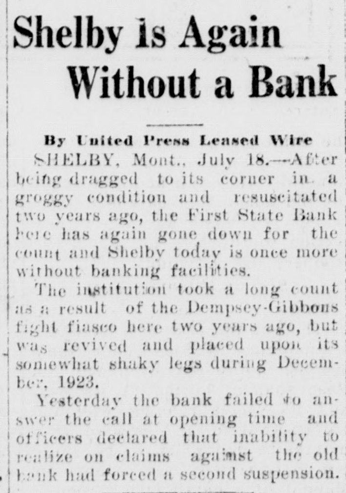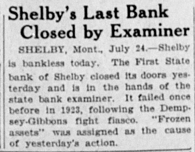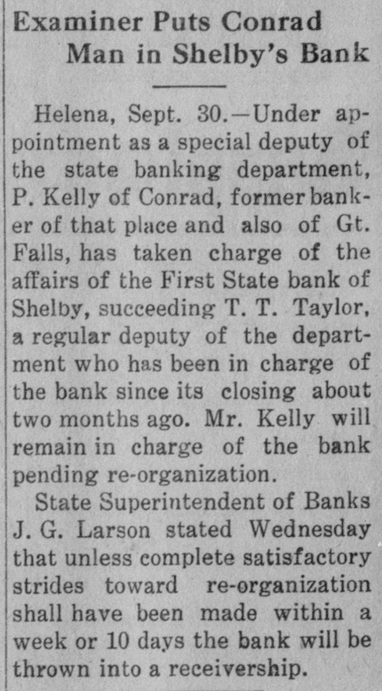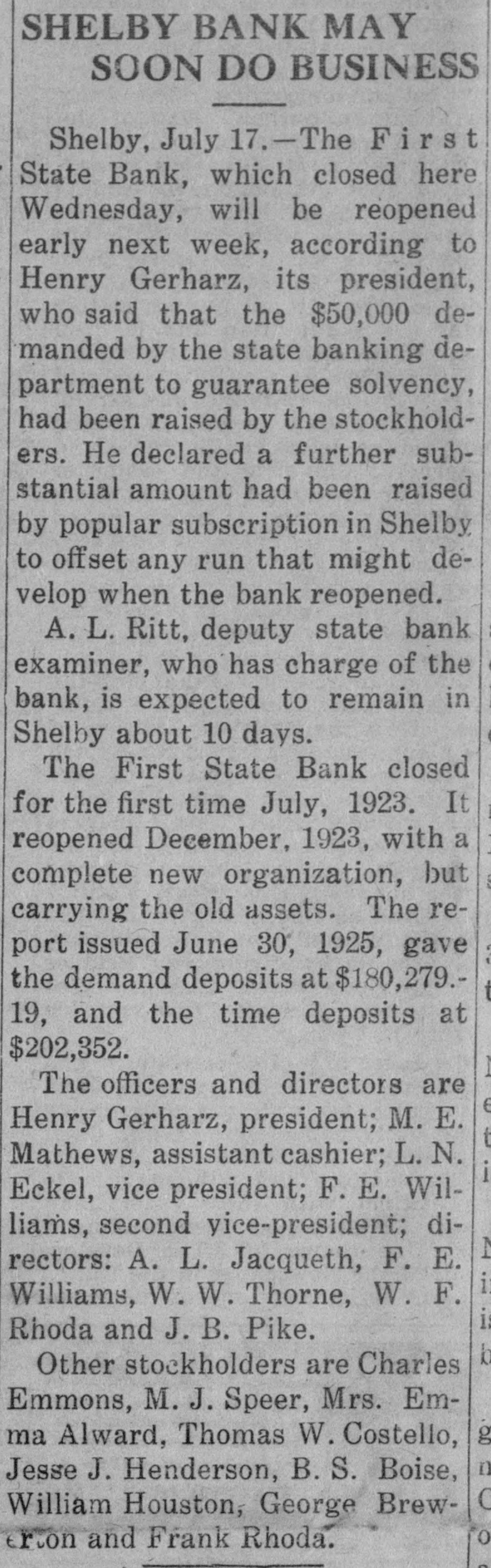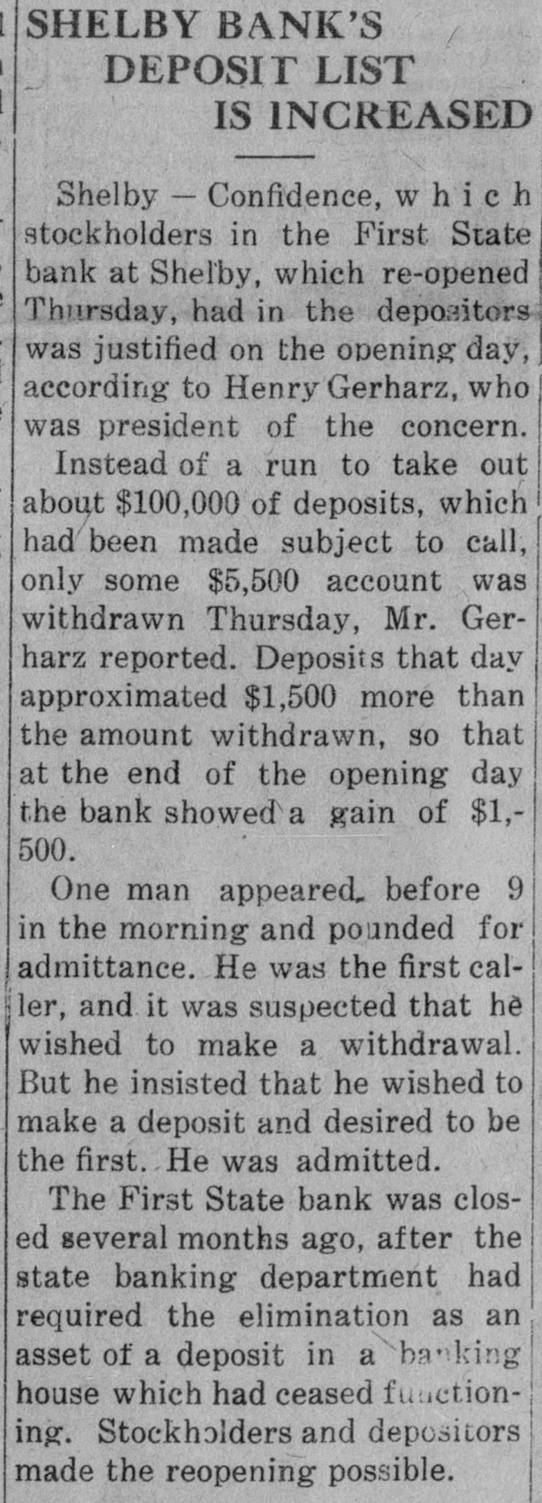 The bank's officers now are: Eckel, president; Williams Douglas Parker, Hilliard, experienced and practical banker, Mr. cashier. Hilliard has been bank for and for years, some time past been connected with the First International bank Sweet Grass cashDouglas Parker also chairof the board of directors, fact that alone should inspire confidence recalled that his masterful direction of the Sweet Grass bank rescued from tottering institution and placed solid footing. These men, well others of equal ability, are now in charge of the destinies of the First State Bank. To the stockholders and depositors given the major credit for the re-opening, for without their willingness and in some cases eagerness real sacrifices, would have been impossible. The board of ectors also have been unceasingly active and especially Gerwas Henry harz, who spent practically his entire time since the closing in endeavor to have the bank again going certainly has been very alous situation, city the size Shelwithout bank, when there very probably no more desirable location the entire state. Little towns all prospering measure, doubt on account of our misfortune this respect during the past years. Outside people, of not understand the situation, justified in the absurb belief that Shelby could not support bank. The wonder that the city has stood well under the disaster and the stigma attached and caused by the several bank here. But Shelby sound core and fortunate having class of who believe themselves the future Shelby. They have tasted defeat and misfortune time again; the banking situation many they have been the ragged edge often that their sensibilities have been seared, and fortune was complacently turn, and the belief doggedly expressed, from fighting mayor down the that "things will change appears that are at last that turning point. sound good, bank is of the chief essentials for town's prosperity; believe that finally have one: least, stance there, ready to be worked solid, concrete structure the continued backing of the citizens. take time, to course, overcome the prejudice which undoubtedly justified, but should be overcome. Let speak nothing but good words for the bank; moral effect quite necessary. Knock the knocker; boost with the booster, and all