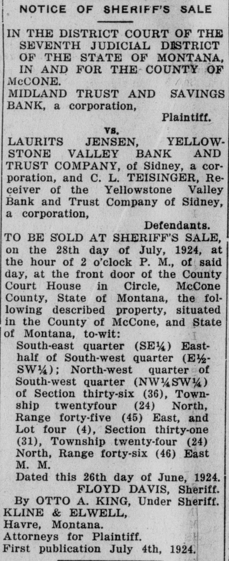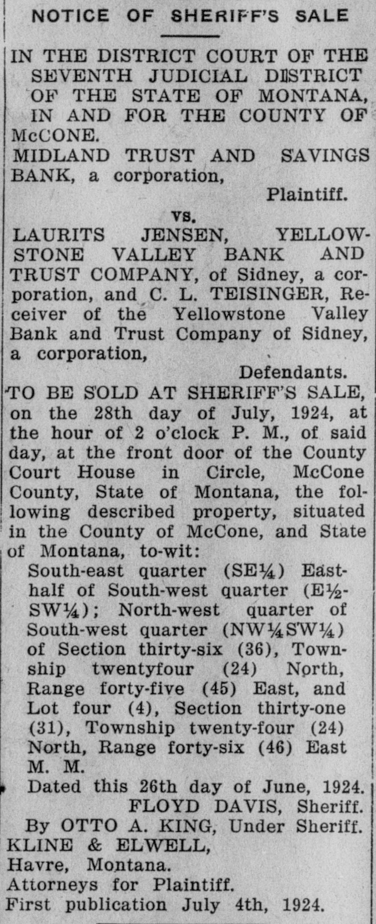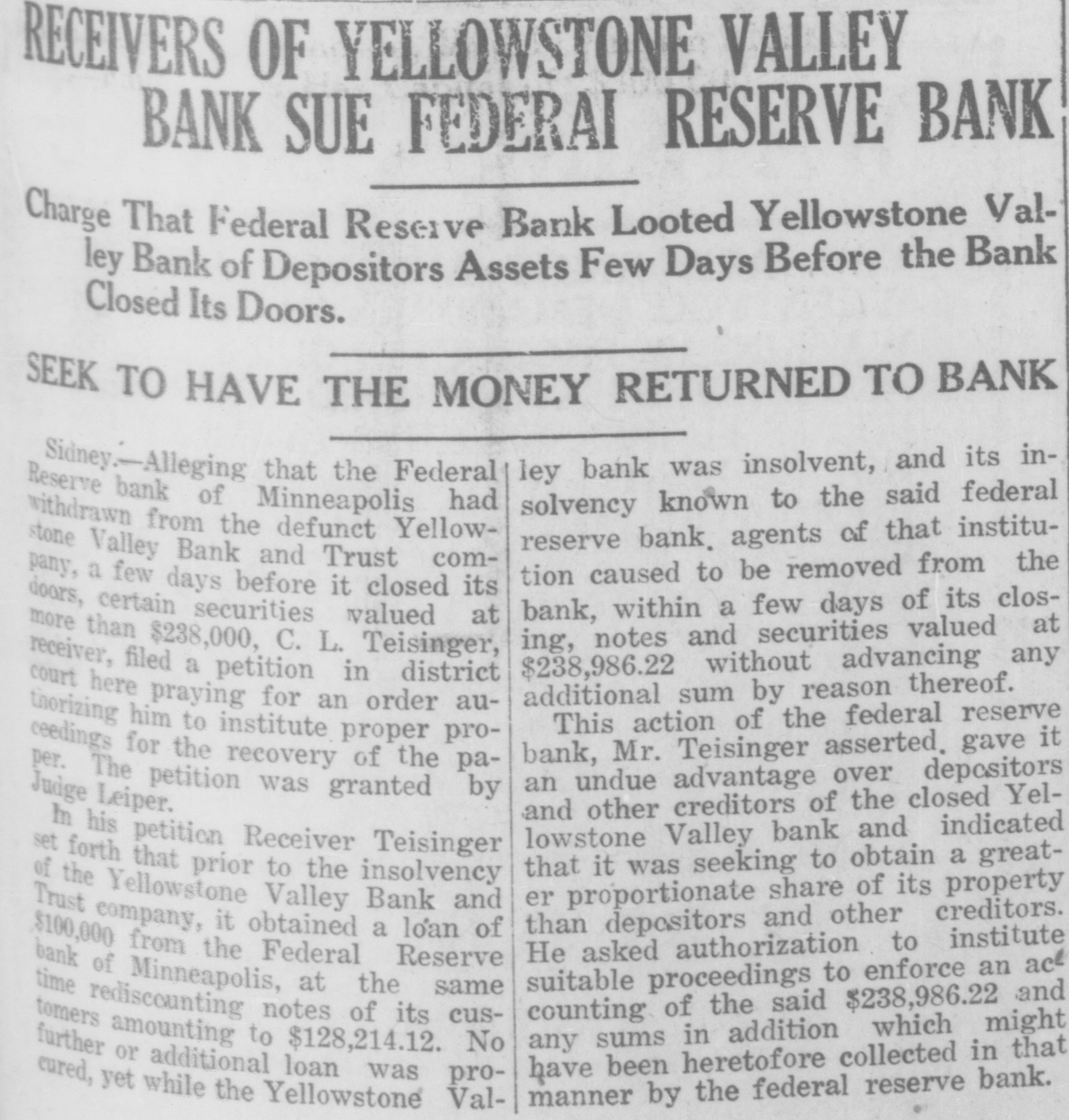 RECEIVERS OF YELLOWSTONE VALLEY BANK SUE FEDERAI RESERVE BANK ValCharge That Federal Reserve Bank Looted Yellowstone ley Bank of Depositors Assets Few Days Before the Bank Closed Its Doors. SEEK TO HAVE THE MONEY RETURNED TO BANK ley bank was insolvent, and its inSidney.-Alleging Federal bank of had solvency known to the said federal Reserve withdrawn Minneapolis that the from the defunct Yellowreserve bank. agents of that institustone Valley Bank tion caused to be removed from the a few days before its certain bank, within a few days of its closdoors, more pany, than securities and Trust it valued closed com$238,000, C. L. ing, notes and securities valued at filed a $238,986.22 without advancing any additional sum by reason thereof. for thorizing receiver, court here praying petition an in Teisinger, order district au- at This action of the federal reserve him to institute bank, Mr. Teisinger asserted. gave it ceedings per. for the recovery proper of the pro- paan undue advantage over depositors Judge The Leiper. petition was granted by and other creditors of the closed Yelpetition lowstone Valley bank and indicated that it was seeking to obtain a greatthat prior to In the forth his Receiver the insolvency Teisinger er proportionate share of its property Trust of Yellowstone Valley Bank and than depositors and other creditors. company, it obtained loan He asked authorization to institute $100,000 bank from the Federal a of suitable proceedings to enforce an ace time of Minneapolis, at the Reserve counting of the said $238,986.22 and remidescounting notes of its same any sums in addition which might further amounting to $128,214.12. cus- No or additional loan have been heretofore collected in that manner by the federal reserve bank. cured, yet while the Yellowstone was Val- pro-
