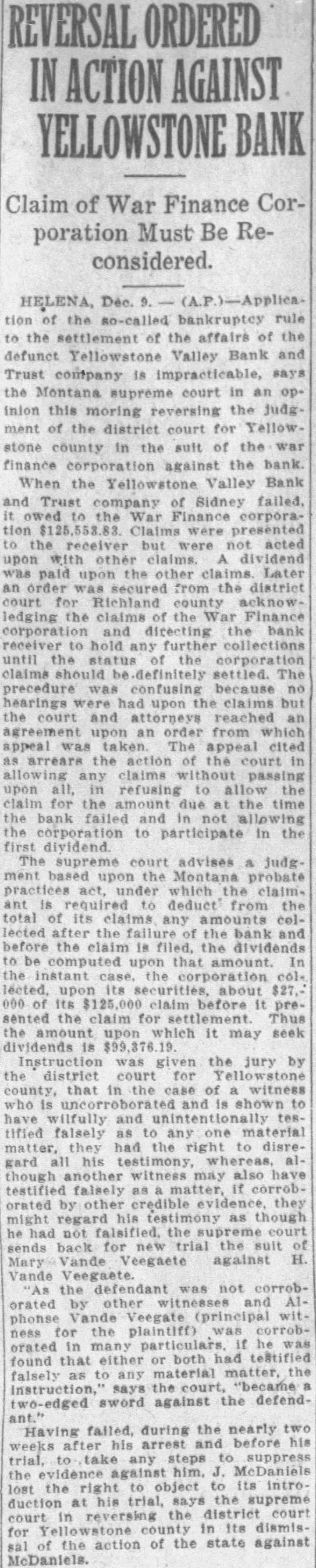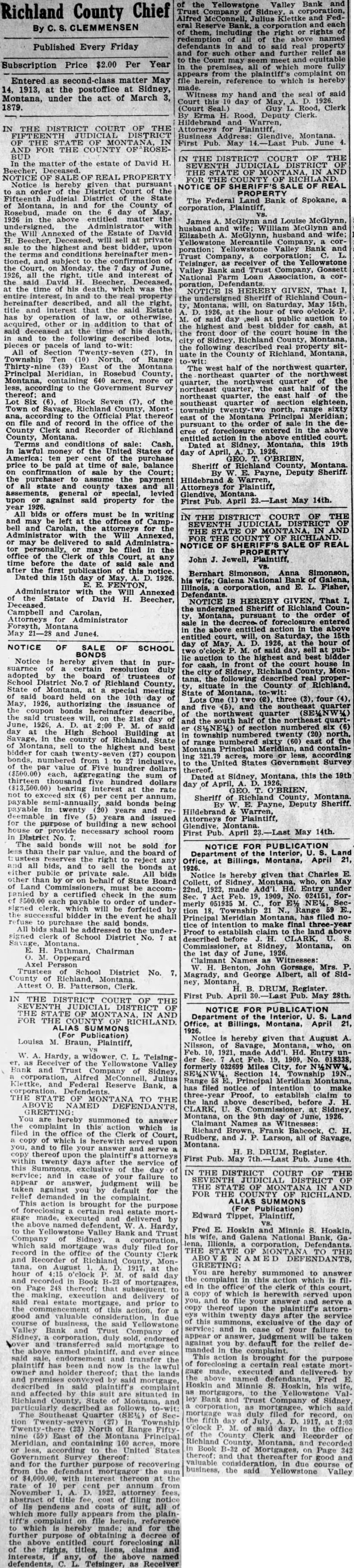 James and Louise McGlynn, husband and wife; William and Elizabeth McGlynn, and wife; Yellowstone Mercantile Company corporation; Yellowstone Valley Bank and Trust Telsinger as the Yellowstone Valley and Trust Company, Gossett National Farm Loan Association, a corporation, Defendants. NOTICE IS HEREBY GIVEN, That the Sheriff Richland ty, Montana, May 15th, D. 1926, the hour of two o'clock said day sell at public auction to the highest and best bidder for cash, the court in the city of Sidney Richland the real situate in the County of Richland, Montana, to-wit: west half of the quarter, the quarter the northwest quarter, northwest the northeast quarter, the east half of the northeast quarter, the east half the southeast quarter section eighteen, township north, sixty of the Montana Principal Meridian; the of sale in the decree entered in the above entitled action in the above entitled court. Dated at Montana, this 19th day of April, D. O'BRIEN, Sheriff of Montana. W E. Payne, Deputy Sheriff. Hildebrand Warren, Attorneys for Plaintiff, Glendive, First Pub April May 14th.