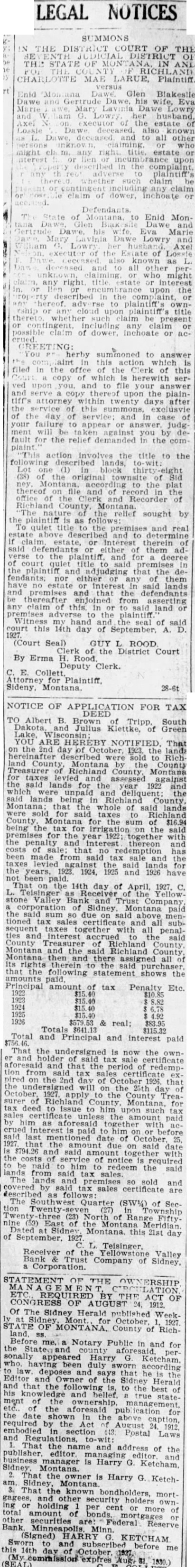 W. Hardy, C. L. Teisingas of the Valley Bank and Trust Company of Sidney, Alfred McConnell, Julius Klettke, and Federal Reserve Bank, THE OF TO THE ABOVE DEFENDANTS, GREETING: You hereby to answer the complaint this action which filed the the of Court, is upon you, and to file your answer and copy thereof the plaintiff's attorneys within twenty days after the service exclusive of the day service; and of your appear or will taken against you default for the relief demanded the complaint. This action brought for the purpose of certain real estate mortgage by the named W. Hardy, to the Valley Bank and Trust Company Sidney, which said mortgage was duly filed for record in the the County Clerk and County, tana, on the hour 4:15 o'clock of said day and recorded in Book B-23 of mortgages, Page 248 thereof; that subsequent the delivery said real and prior of this for good and valuable due course business, the said Yellowstone Sidney Valley Bank and Company corporation, duly sold, tover and transferred said the above named plaintiff, and said endorsement and transfer the plaintiff has been and now the lawful and holder that the lands and mortgage, in said and by this suit situated in Richland County, State of Montana, and particularly described as follows, (SE%) of Sec(27) (23) of Fiftynine (59) East the Meridian, and containing 160 acres, more or less, according to the United States Survey thereof and for the further purpose of recovering from the mortgagor the sum of $4,000.00, with interest thereon at the rate of 10 per cent per annum from November D. 1922, attorney abstract of title fee, cost filing notice of lis costs of suit, all which more fully the plain tiff's file reference which is hereby made; and for the further obtaining decree of the entitled court foreclosing all of the claims and interests. the named defendents, C. Tefsinger, as Receiver the Yellowstone Valley Bank and Trust Company of Sidney, corporation, Alfred McConnell, Julius Klettke and FedBank, and them, the right or rights redemption of all of the named defendants in and said real property and for such other and further relief as the Court may the all more fully from the on file herein, to which is hereby made. Witness my hand and the seal of said Court this day of May, 1926 (Court Guy Rood, Clerk Erma H. Rood, Deputy Clerk. Hildebrand Warren, Attorneys for Plaintiff, Montana. First Pub. May June