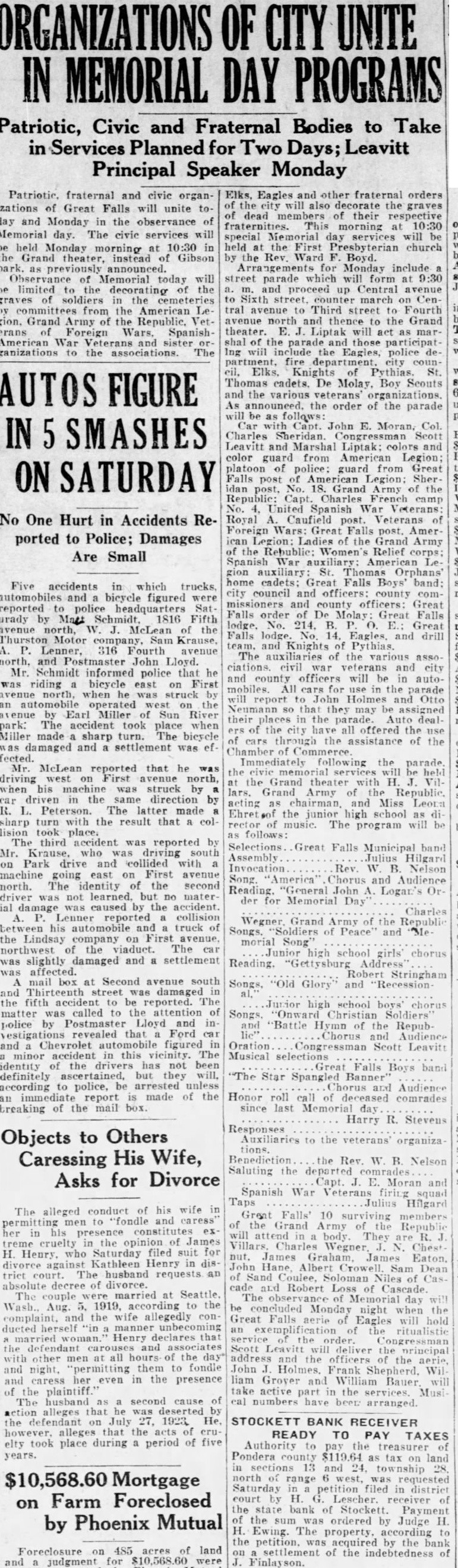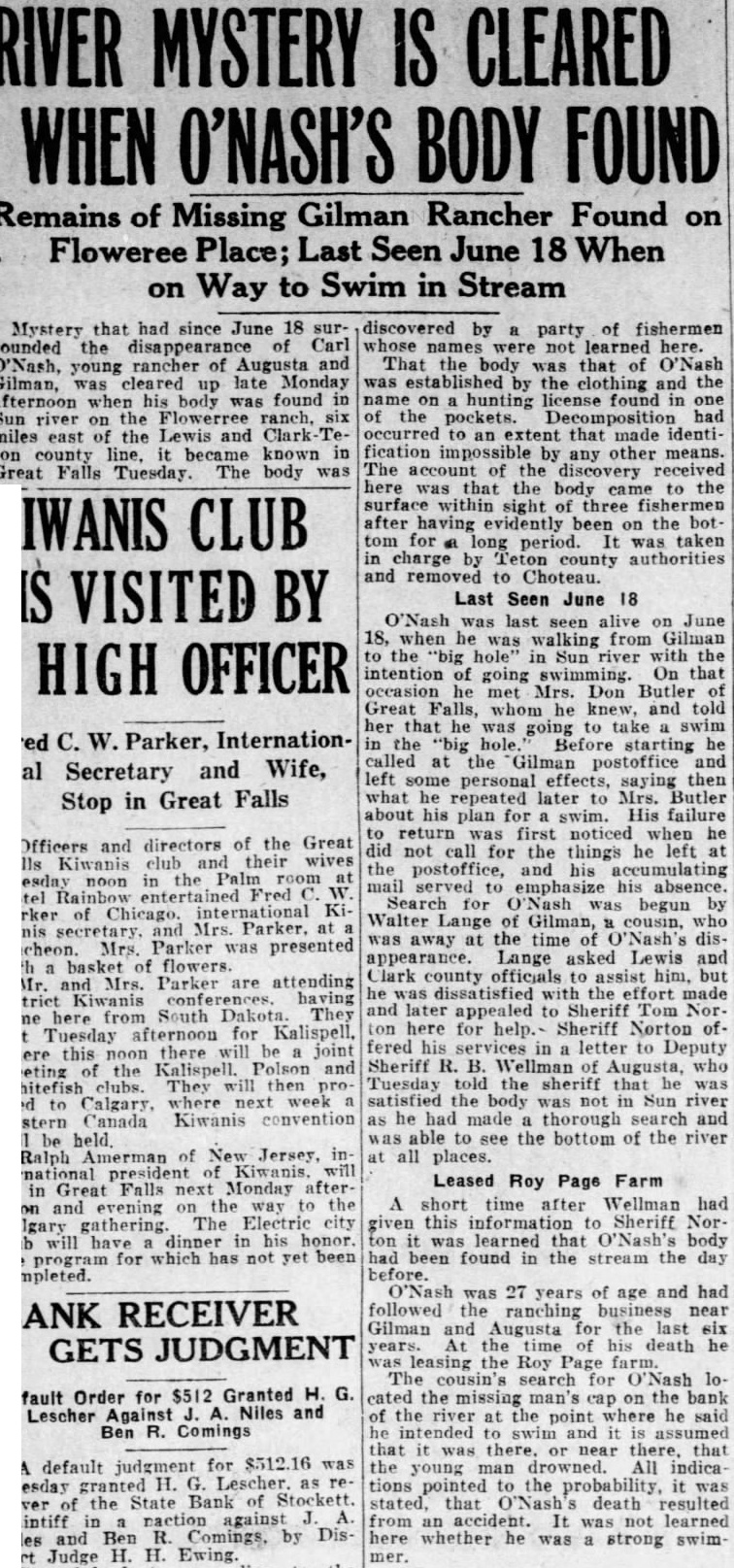 RIVER MYSTERY IS CLEARED WHEN O'NASH'S BODY FOUND Remains of Missing Gilman Rancher Found on Floweree Place; Last Seen June 18 When on Way to Swim in Stream Mystery that had since June 18 surcounded the disappearance of Carl O'Nash, young rancher of Augusta and Gilman, cleared up late Monday afternoon when his body was found in Sun river on the Flowerree ranch. six miles east the Lewis and Clark-Teton county line, it became known in Great Falls Tuesday. The body was discovered by a party of fishermen whose names were not learned here. That the body was that of O'Nash was established by the clothing and the name on hunting license found in one of the pockets. Decomposition had occurred to an extent that made identification impossible by any other means. The account of the discovery received here was that the body came to the surface within sight of three fishermen KIWANIS CLUB after having evidently been on the bot tom for OR long period. was taken in charge by Teton county authorities and removed to Choteau. IS VISITED BY Last Seen June 18 O'Nash was last seen alive on June 18, when he was walking from Gilman to the "big hole" in Sun river with the HIGH OFFICER intention of going swimming. On that occasion he met Mrs. Don Butler of Great Falls, whom he knew, and told her that he was going to take swim Fred C. W. Parker, Internationin the "big hole. Before starting he called at the Gilman postoffice and al Secretary and Wife, left some personal effects, saying then Stop in Great Falls what he repeated later to Mrs. Butler about his plan for swim. His failure to return was first noticed when he Officers and directors of the Great did not call for the things he left at Falls Kiwanis club and their wives the postoffice, and accumulating Tuesday noon in the Palm room at mail served to emphasize his absence. Hotel Fred W. Search for "Nash was begun by Parker of Chicago. international KiWalter Lange of Gilman, cousin, who wanis secretary. and Mrs. Parker, at was away at the time of "Nash's disluncheon. Mrs. Parker was presented appearance. Lange asked Lewis and with a basket of flowers. Clark county officials to assist him, but Mr. and Mrs. Parker are attending he dissatisfied with the effort made district Kiwanis conferences. having and later appealed to Sheriff Tom Norcome here from South Dakota. They ton here for help.- Sheriff Norton of left Tuesday afternoon for Kalispell, fered his services in a letter to Deputy where this noon there will be joint meeting of the Kalispell. Polson and Sheriff R. B. Wellman of Augusta, who Whitefish clubs. They will then pro- Tuesday told the sheriff he was ceed to Calgary, where next week satisfied the body was not in Sun river western Canada Kiwanis convention as he had made a thorough search and was able to see the bottom of the river Ralph Amerman of New Jersey, in- at all places. ternational president of Kiwanis. will Leased Roy Page Farm be in Great Falls next Monday afterA short time after Wellman had noon and evening on the way to the Calgary gathering. The Electric city given this information to Sheriff Norclub will have dinner in his honor ton it learned that O'Nash's body the program for which has not yet been had been found in the stream the day before. O'Nash was 27 years of age and had followed the ranching business near BANK RECEIVER Gilman and Augusta for the last six years. At the time of his death he GETS JUDGMENT was leasing the Roy Page farm. The cousin's search for O'Nash loDefault Order for $512 Granted H. G. cated the missing man's cap on the bank Lescher Against J. A. Niles and of the river at the point where he said Ben R. Comings he intended to swim and it is assumed that it was there. or near there, that A default judgment for $512.16 was the young man drowned. All indica Tuesday granted H. G. Lescher. as re- tions pointed the probability, it was ceiver of the State Bank of Stockett. stated, that O'Nash's death resulted plaintiff in naction against A. from an accident. It was not learned Niles and Ben R. Comings, by Dis- here whether he was a strong swimtrict Judge H. H. Ewing. mer.