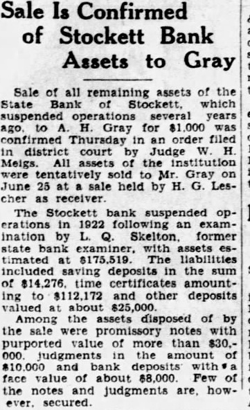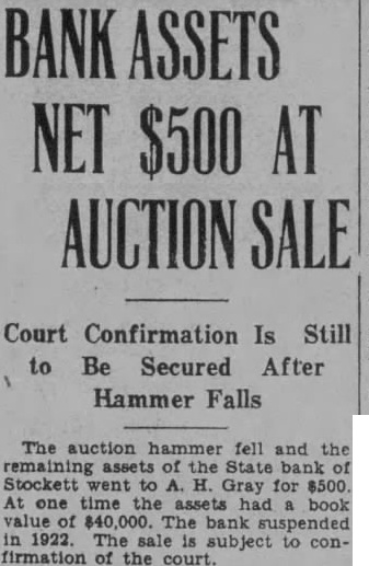 STOCKETT BANK ASSETS SELL FOR $500 AT PUBLIC AUCTION