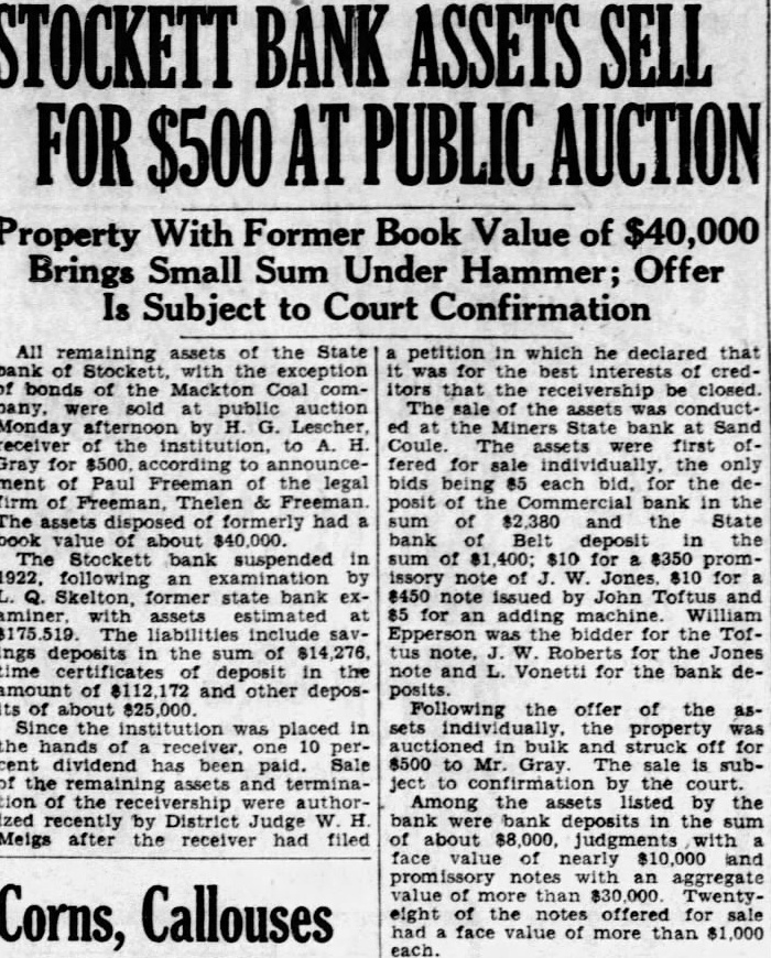 All remaining assets of the State bank of Stockett with the exception of bonds of the Mackton Coal combany, were sold at public auction Monday afternoon by H. G. Lescher, receiver of the institution. to A. H. Gray for $500. according to announcement of Paul Freeman of the legal firm of Freeman, Thelen & Freeman The assets disposed of formerly had a book value of about $40,000. The Stockett bank suspended in 1922. following an examination by L. Q. Skelton, former state bank examiner. with assets estimated at The liabilities include savings deposits in the sum of $14,276, time certificates of deposit in the amount of 8112 172 and other deposits of about $25,000. Since the institution was placed in the hands of receiver. one 10 percent dividend has been paid. Sale of the remaining assets and termination of the were authorIzed recently by District Judge W. H Meigs after the receiver had filed petition in which he declared that was for the best interests of creditors that the receivership be closed. The sale the assets was conducted at the Miners State bank at Sand Coule The assets were first offered for sale individually. the only bids being 85 each bid, for the deposit of the Commercial bank in the sum of $2,380 and the State bank of Belt deposit in the sum of $1,400; $10 for $350 promissory note of J. W. Jones. 810 for 8450 note issued by John Toftus and 85 for an adding machine William Epperson was bidder for the Toftus note. J. W. Roberts for the Jones note and L. Vonetti for the bank deposits. Following the offer of the assets individually, the property was auctioned in bulk and struck off for $500 to Mr. Gray. The sale is subject to confirmation by the court. Among the assets listed by the bank were bank deposits in the sum of about $8,000, judgments with face value of nearly $10,000 and promissory notes with an aggregate value of more than $30,000 TwentyCorns, Callouses eight of the notes offered for sale had face value of more than $1,000 each.