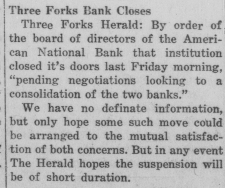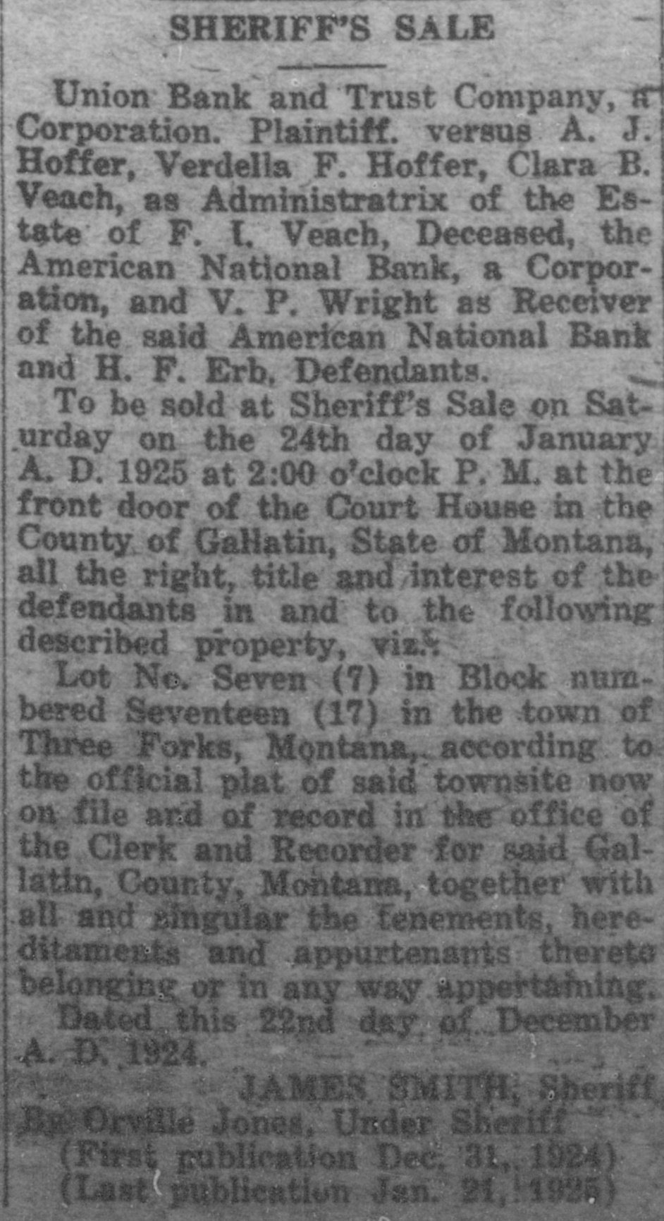 SHERIFF'S SALE Union Bank and Trust Company, a Corporation. Plaintiff. versus A. J. Hoffer, Verdella F. Hoffer, Clara B. Veach, as Administratrix of the Estate of F. I. Veach, Deceased, the American National Bank, a Corporation, and V. P. Wright as Receiver of the said American National Bank and H. F. Erb. Defendants. To be sold at Sheriff's Sale on Saturday on the 24th day of January A. D. 1925 at 2:00 o'clock P. M. at the front door of the Court House in the County of GaHatin, State of Montana, all the right, title and interest of the defendants in and to the following described property, viz.4 Lot No. Seven (7) in Block numbered Seventeen (17) in the town of Three Forks, Montana, according to the official plat of said townsite now on file and of record in the office of the Clerk and Recorder for said Gallatin, County, Montana, together with all and singular the tenements, hereditaments and appurtenants thereto belonging or in any way appertaming. Dated this 22nd day of December ,A, D7,1924, JAMES smith, Sheriff Bg: Orville Jones, Under Sheriff (First publication Dec, 31, 1924) (Last publication Jan. 21, 1925)
