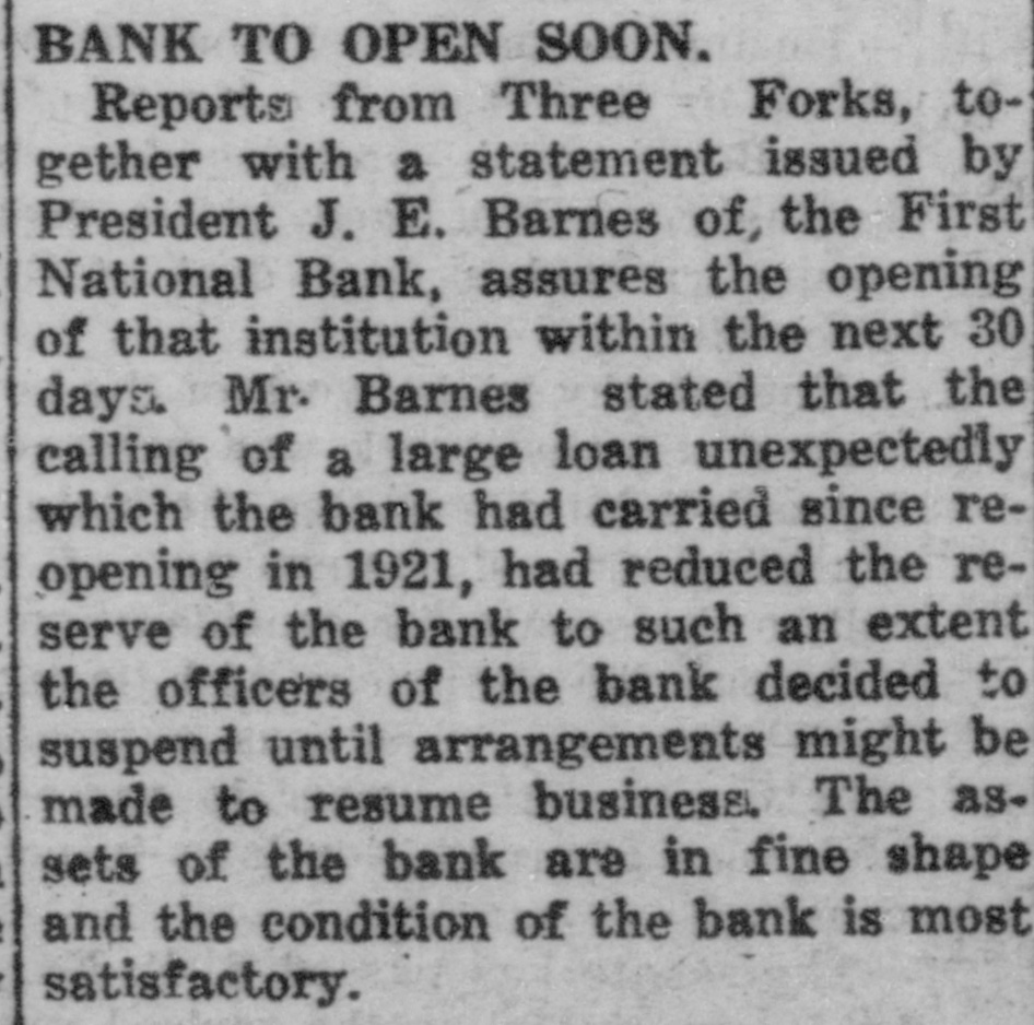 BANK TO OPEN SOON. Reports from Three Forks, together with a statement issued by President J. E. Barnes of, the First National Bank, assures the opening of that institution within the next 30 days. Mr. Barnes stated that the calling of a large loan unexpectedly which the bank had carried since reopening in 1921, had reduced the reserve of the bank to such an extent the officers of the bank decided to suspend until arrangements might be made to resume business. The assets of the bank are in fine shape and the condition of the bank is most satisfactory.