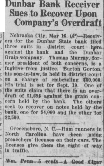 The first of what is predicted to be long list civil actions arising from the spectacular failure the Dunbar State Bank and the financial troubles of the Dunbar Grain Company, interlocking concerns insofar as the bank's failure is concerned, was filed in district court Saturday Receiver for the Dunbar State Bank whose president. Thomas Murray, is a much-sought fugitive from justice in dozen states and two or three foreign countries. brought suit Saturday against the Grain Company on three counts. The Bank alleges that the Grain Company, whose manager Burton Gorton faces prosecution on charges. embezzlement amounting to more than had an overdraft of $1,695.36 at the time of the bank's closing, and owes two notes, past due, one for $4,000 and another for $2,500. Stockholders of the grain company are substantial farmers living in and near Dunbar but the summons in the case is directed only against the Dunbar Grain Company.