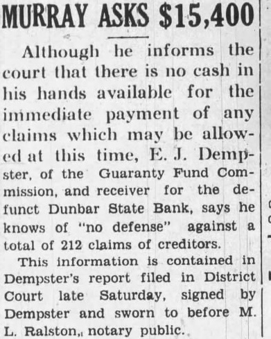 MURRAY ASKS he informs the Although court that there is no cash in his hands available for the immediate payment of any claims which be allowmay at this time, Dempster. of the Guaranty Fund Commission, and receiver for the deDunbar State Bank, says he funct knows of "no defense" against total of 212 claims of creditors. This information contained in Dempster's report filed in District Court late Saturday, signed by Dempster and sworn to before M. L. Ralston, notary public.