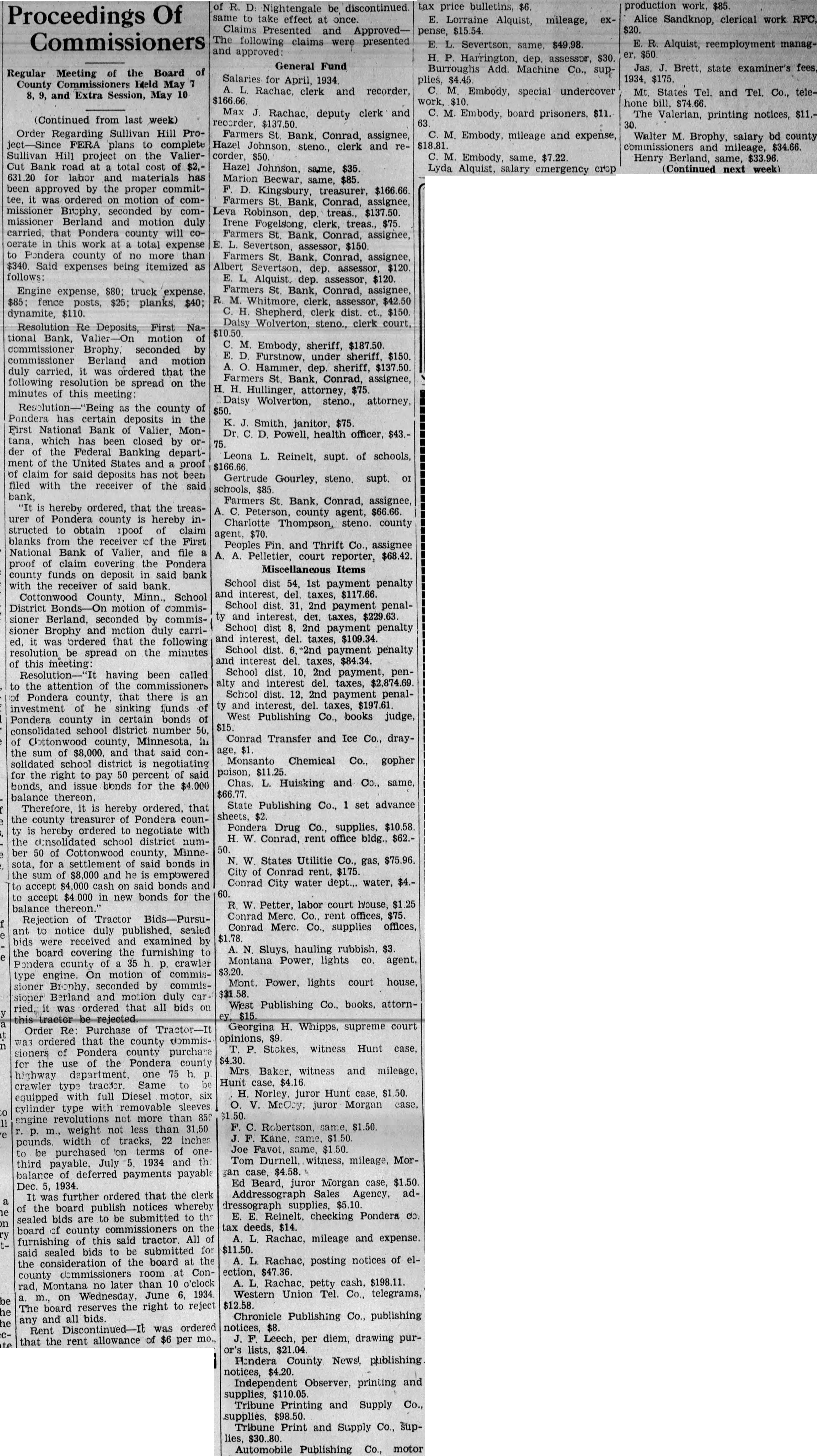 Engine expense, $80; truck expense, $85; fence posts, $25; planks, $40; dynamite, $110. Resolution Re Deposits, First National Bank, Valier-On motion of commissioner Brophy. seconded by commissioner Berland and motion duly carried, it was ordered that the following resolution be spread on the minutes of this meeting: Resolution-"Being as the county of Pondera has certain deposits in the First National Bank of Valier, Montana, which has been closed by order of the Federal Banking department of the United States and proof of claim for said deposits has not been filed with the receiver of the said bank, "It is hereby ordered, that the treasurer of Pondera county is hereby instructed to obtain ipoof of claim blanks from the receiver of the First National Bank of Valier, and file a proof of claim covering the Pondera county funds on deposit in said bank with the receiver of said bank. Cottonwood County, Minn. School District Bonds- motion of commissioner Berland. seconded by commissioner Brophy and motion duly carried. it was ordered that the following resolution be spread on the minutes of this meeting: Resolution-"It having been called to the attention of the commissioners of Pondera county, that there is an investment of he sinking funds of Pondera county in certain bonds of consolidated school district number 50, of Chttonwood county, Minnesota, in the sum of $8,000. and that said consolidated school district is negotiating for the right to pay 50 percent of said bonds, and issue blonds for the $4.000 balance thereon, Therefore, it is hereby ordered, that the county treasurer of Pondera county is hereby ordered to negotiate with the dinsolidated school district number 50 of Cottonwood county, Minnesota, for a settlement of said bonds in the sum of $8,000 and he is empowered to accept $4,000 cash on said bonds and to accept $4.000 in new bonds for the balance thereon. Rejection of Tractor Bids-Pursuant to notice duly published, sealed bids were received and examined by the board covering the furnishing to Pondera county of a 35 h p. crawler type engine. On motion of commissioner Brophy. seconded by commissioner Berland and motion duly car ried, it was ordered that all bids on Order Re: Purchase of Tractor-It was ordered that the county commissioners of Pondera county purchase for the use of the Pondera county highway department. one 75 h. crawler type tracter Same to be equipped with full Diesel motor, six cylinder type with removable sleeves engine revolutions not more than 850 p. m., weight not less than 31.50 pounds. width of tracks, 22 inches to be purchased on terms of onethird payable, July 5. 1934 and th balance of deferred payments payable Dec. 5, 1934. It was further ordered that the clerk of the board publish notices whereby sealed bids are to be submitted to th board of county commissioners on the furnishing of this said tractor. All of said sealed bids to be submitted for the consideration of the board at the county commissioners room at Conrad, Montana no later than 10 o'clock a. m., on Wednesday, June 6, 1934 The board reserves the right to reject any and all bids. Rent Discontinued-It was ordered that the rent allowance of $6 per mo., of R. D: Nightengale be discontinued same to take effect at once Claims Presented and ApprovedThe following claims were presented and approved: