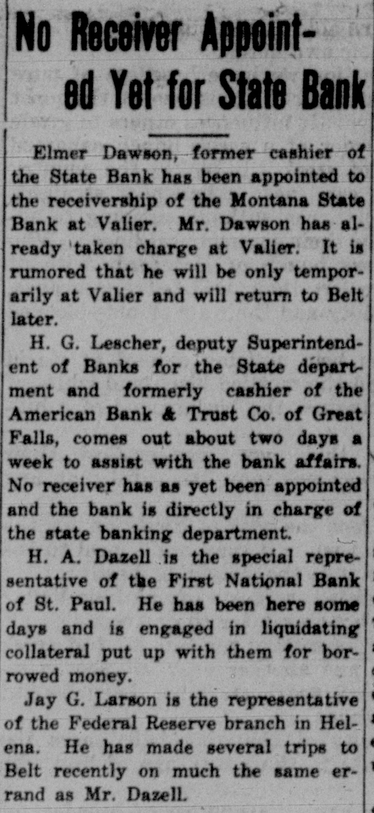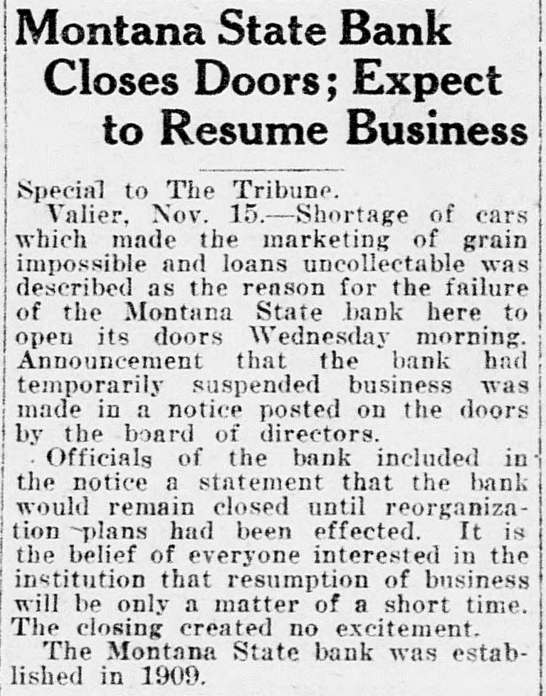 Montana State Bank Closes Doors; Expect to Resume Business Special to The Tribune. Valier, Nov. 15.-Shortage of cars which made the marketing of grain impossible and loans uncollectable was described as the reason for the failure of the Montana State bank here to open its doors Wednesday morning. Announcement that the bank had temporarily suspended business was made in a notice posted on the doors by the board of directors. Officials of the bank included in the notice a statement that the bank would remain closed until reorganization plans had been effected. It is the belief of everyone interested in the institution that resumption of business will be only a matter of a short time. The closing created no excitement. The Montana State bank was established in 1909.