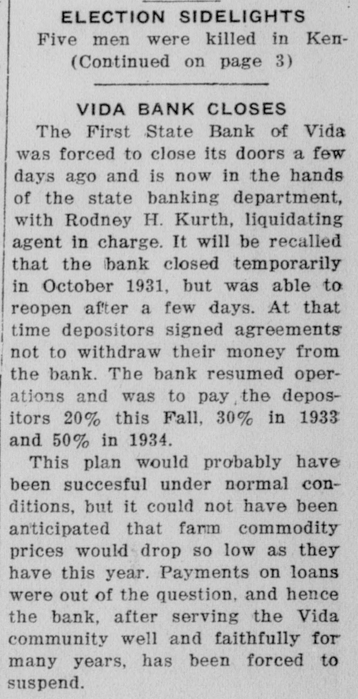 ELECTION SIDELIGHTS Five men were killed in Ken(Continued on page 3) VIDA BANK CLOSES The First State Bank of Vida was forced to close its doors a few days ago and is now in the hands of the state banking department, with Rodney H. Kurth, liquidating agent in charge. It will be recalled that the bank closed temporarily in October 1931, but was able to reopen after a few days. At that time depositors signed agreements not to withdraw their money from the bank. The bank resumed operations and was to pay the depositors 20% this Fall, 30% in 1933 and 50% in 1934. This plan would probably have been succesful under normal conditions, but it could not have been anticipated that farm commodity prices would drop SO low as they have this year. Payments on loans were out of the question, and hence the bank, after serving the Vida community well and faithfully for many years, has been forced to suspend.