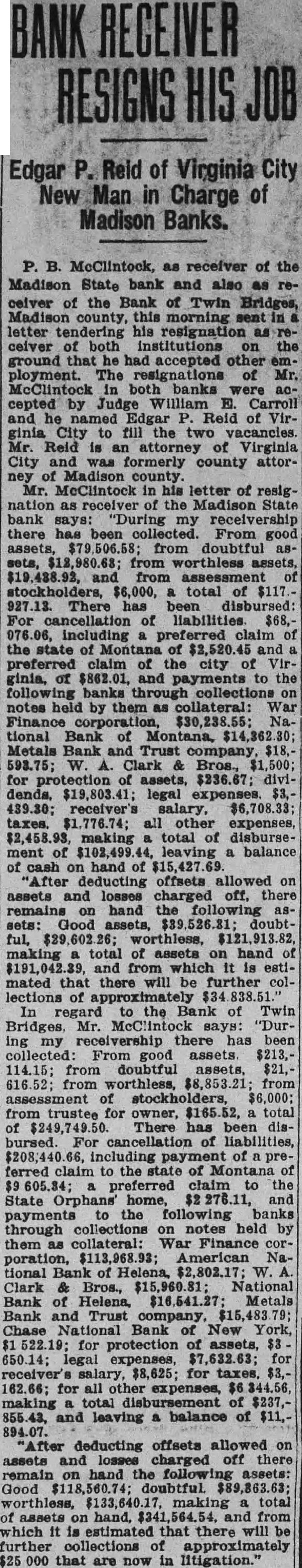 BANK RECEIVER RESIGNS HIS JOB Edgar P. Reid of Virginia City New Man in Charge of Madison Banks. P. B. McClintock, as receiver of the Madison State bank and also as receiver of the Bank of Twin Bridges, Madison county, this morning sent in letter tendering his resignation as receiver of both institutions on the ground that he had accepted other employment. The resignations of Mr. McClintock in both banks were accepted by Judge William E. Carroll and he named Edgar P. Reid of Virginia City to fill the two vacancies Mr. Reid is an attorney of Virginia City and was formerly county attorney of Madison county Mr. McClintock in his letter of resignation as receiver of the Madison State bank says: "During my receivership there has been collected. From good assets, $79,506.58; from doubtful as. sets, $12,980.68; from worthless assets, $19,488.92, and from assessment of stockholders, $6,000, total of $117 927.13. There has been disbursed: For cancellation of liabilities $68,076.06, including a preferred claim of the state of Montana of $2,520. 45 and preferred claim of the city of Virginia, of $862.01, and payments to the following banks through collections on notes held by them as collateral: War Finance corporation, $30,238.55; National Bank of Montana, $14,362.30; Metals Bank and Trust company, $18,598.75; W. A. Clark & Bros., $1,500; for protection of assets, $236.67; dividends, $19,803.41; legal expenses. $3,439.30; receiver's salary, $6,708.33; taxes. $1,776.74; all other expenses, $2,458.93, making total of disbursement of $102,499.4 leaving a balance of cash on hand of $15,427.65 "After deducting offsets allowed on assets and losses charged off, there remains on hand the following assets: Good assets, $39 526.31; doubtful, $29,602.26; worthless, $121,913.82, making a total of assets on hand of $191,042.39, and from which It is estimated that there will be further collections of approximately $34 838.51. In regard to the Bank of Twin Bridges, Mr. McClintock says: "During my receivership there has been collected: From good assets. $213,114.15; from doubtful assets, $21,616.52; from worthless, $8,853.21; from assessment of stockholders, $6,000; from trustee for owner, $165.52, a total of $249,749.50. There has been disbursed. For cancellation of liabilities, $208,440. including of a preferred claim to the state of Montana of $9 605. a preferred claim to the State Orphans home, 276.11, and payments to the following banks through collections on notes held by them as collateral: War Finance corporation, $113,968.93; American National Bank of Helena, $2,802.17; W. A. Clark & Bros., $15,960.81; National Bank of Helena, $16,541.27; Metals Bank and Trust company, $15,483.79; Chase National Bank of New York, $1 522.19; for protection of assets, $3 650.14; legal expenses, $7,632.63; for receiver's salary, $8,625; for taxes, $3,162.66; for all other expenses, $6 $44.56, making total disbursement of $237,855.43, and leaving a balance of $11,894.07. "After deducting offsets allowed on assets and losses charged off there remain on hand the following assets: Good $118,560.74; doubtful $89,863.63; worthless, $133,640.17, making a total of assets on hand, $341,564.54, and from which it is estimated that there will be further collections of approximately $25 000 that are now in litigation.'