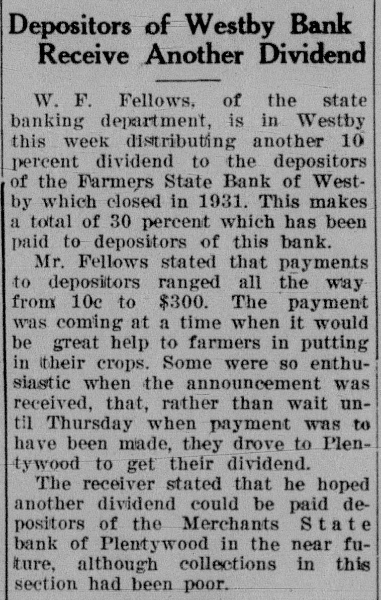 Depositors of Westby Bank Receive Another Dividend W. F. Fellows, of the state banking department, is in Westby this week distributing another 10 percent dividend to the depositors of the Farmers State Bank of Westby which closed in 1931. This makes a total of 30 percent which has been paid to depositors of this bank. Mr. Fellows stated that payments to depositors ranged all the way from 10c to $300. The payment was coming at a time when it would be great help to farmers in putting in their crops. Some were so enthusiastic when the announcement was received, that, rather than wait until Thursday when payment was to have been made, they drove to Plentywood to get their dividend. The receiver stated that he hoped another dividend could be paid depositors of the Merchants State bank of Plentywood in the near future, although collections in this section had been poor.