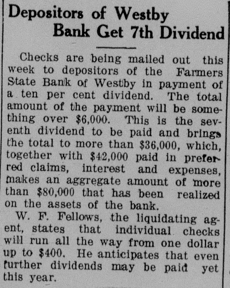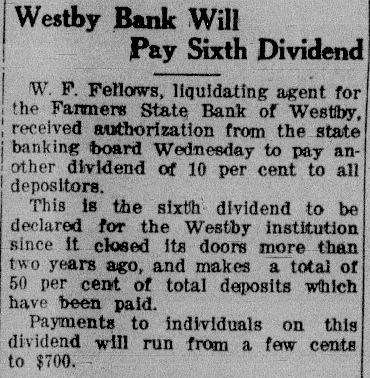 Westby Bank Will Pay Sixth Dividend W. F. Fellows, liquidating agent for the Farmers State Bank of Westiby, received authorization from the state banking board Wednesday to pay another dividend of 10 per cent to all depositors. This is the sixth dividend to be declared for the Westby institution since it closed its doors more than two years ago, and makes a total of 50 per cent of total deposits which have been paid. Payments to individuals on this dividend will run from a few cents to $700.