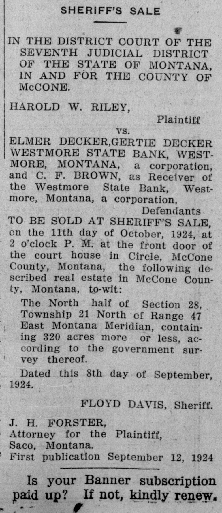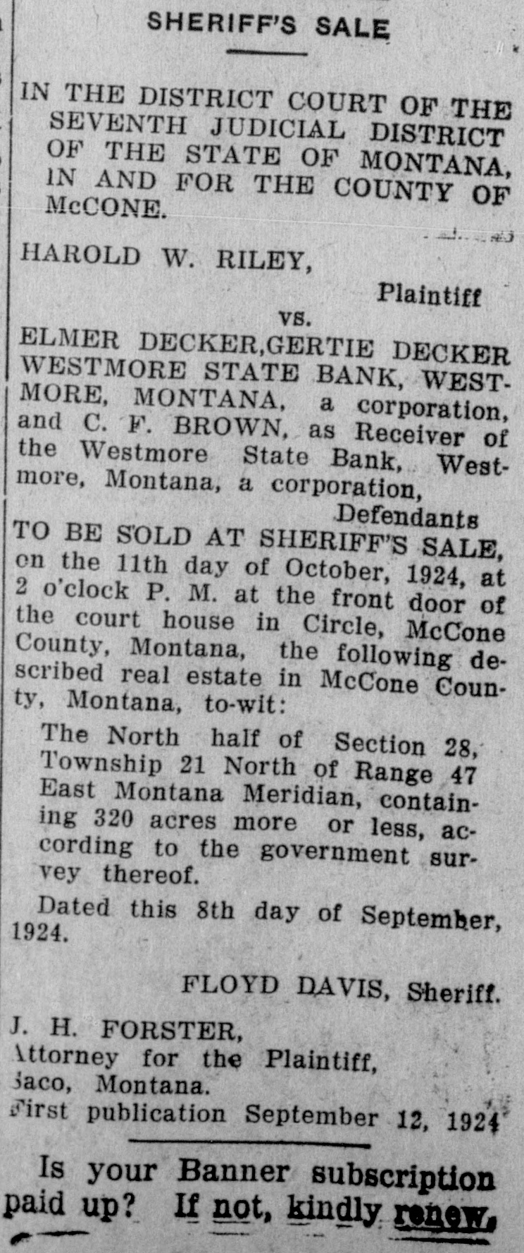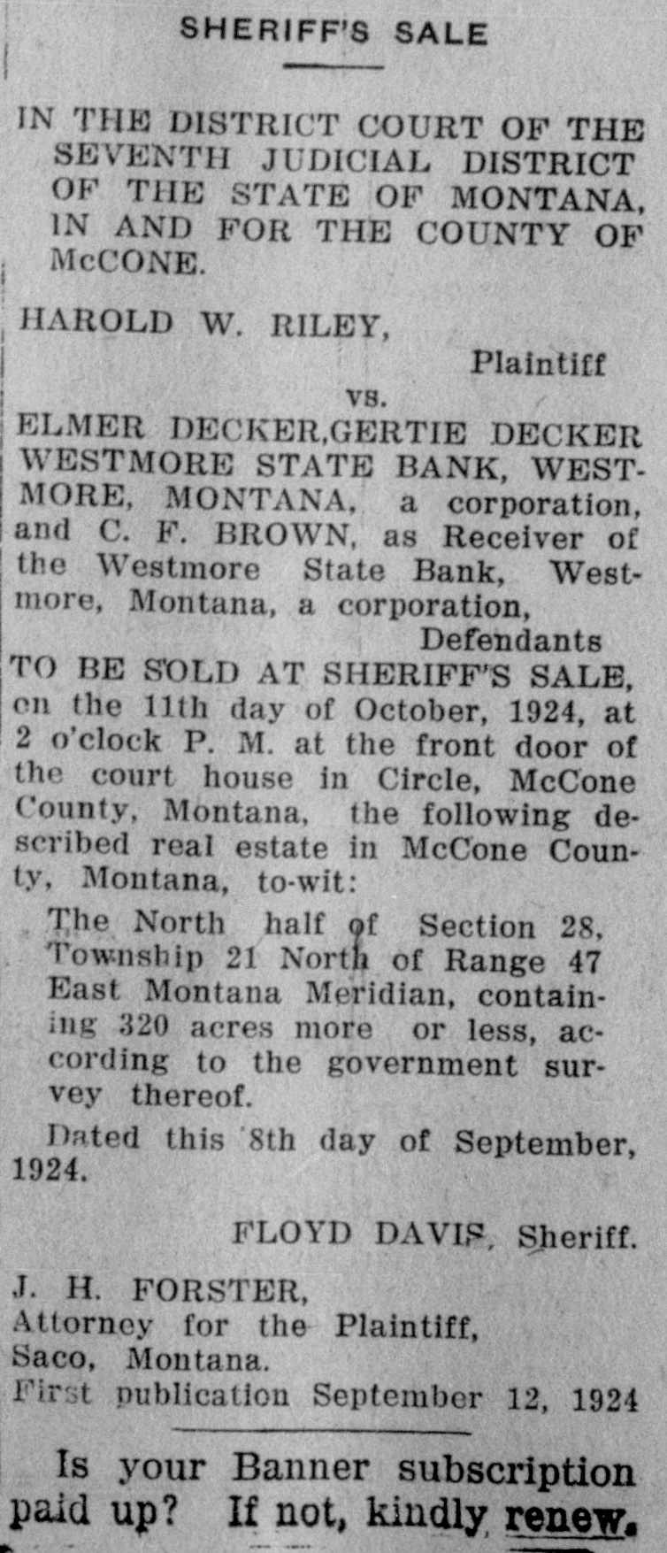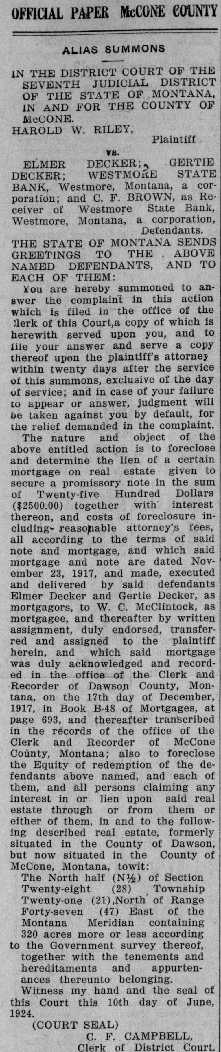 OFFICIAL PAPER McCONE COUNTY ALIAS SUMMONS IN THE DISTRICT COURT OF THE SEVENTH JUDICIAL DISTRICT OF THE STATE OF MONTANA, IN AND FOR THE COUNTY OF McCONE. HAROLD W. RILEY, Plaintiff VS. ELMER DECKER;, GERTIE DECKER; WESTMORE STATE BANK, Westmore, Montana, a corporation; and C. F. BROWN, as Receiver of Westmore State Bank, Westmore, Montana, a corporation, Defendants. THE STATE OF MONTANA SENDS GREETINGS TO THE ! ABOVE NAMED DEFENDANTS, AND TO EACH OF THEM: You are hereby summoned to answer the complaint in this action which is filed in the office of the Clerk of this Court,a copy of which is herewith served upon you, and to file your answer and serve a copy thereof upon the plaintiff's attorney within twenty days after the service of this summons, exclusive of the day of service; and in case of your failure to appear or answer, judgment will be taken against you by default, for the relief demanded in the complaint. The nature and object of the above entitled action is to foreclose and determine the lien of a certain mortgage on real estate given to secure a promissory note in the sum of Twenty-five Hundred Dollars ($2500.00) together with interest thereon, and costs of foreclosure including- reasonable attorney's fees, all according to the terms of said note and mortgage, and which said mortgage and note are dated November 23, 1917, and made, executed and delivered by said defendants Elmer Decker and Gertie Decker, as mortgagors, to W. C. McClintock, as mortgagee, and thereafter by written assignment, duly endorsed, transferred and assigned to the plaintiff herein, and which said mortgage was duly acknowledged and recorded in the office of the Clerk and Recorder of Dawson County, Montana, on the 17th day of December, 1917, in Book B-48 of Mortgages, at page 693, and thereafter transcribed in the records of the office of the Clerk and Recorder of McCone County, Montana; also to foreclose the Equity of redemption of the defendants above named, and each of them, and all persons claiming any interest in or lien upon said real estate through or from them or either of them, in and to the following described real estate, formerly situated in the County of Dawson, but now situated in the County of McCone, Montana, towit: The North half (N½) of Section Twenty-eight (28) Township Twenty-one (21) North of Range Forty-seven (47) East of the Montana Meridian containing 320 acres more or less according to the Government survey thereof, together with the tenements and hereditaments and appurtenances thereunto belonging. Witness my hand and the seal of this Court this 10th day of June, 1924. (COURT SEAL) C. F. CAMPBELL, Clerk of District Court.