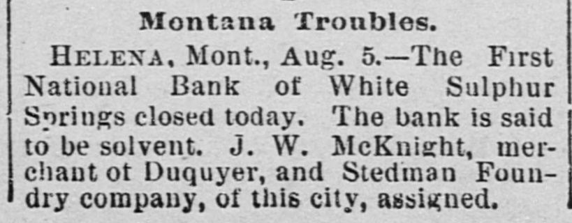 Montana Troubles. HELENA, Mont., Aug. 5.-The First National Bank of White Sulphur Springs closed today. The bank is said to be solvent. J. W. McKnight, merchant of Duquyer, and Stedman Foundry company, of this city, assigned.