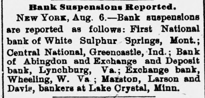 Bank Suspensions Reported. NEW YORK, Aug. 6.-Bank suspensions are reported as follows: First National bank of White Sulphur Springs, Mont.; Central National, Greencastle, Ind.; Bank of Abingdon and Exchange and Deposit bank, Lynchburg, Va.; Exchange bank, Wheeling, W. Va; Marston, Larson and Davis, bankers at Lake Crystal, Minn.