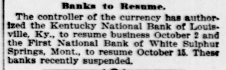 Banks to Resume. The controller of the currency has authorized the Kentucky National Bank of Louisville, Ky., to resume business October 2 and the First National Bank of White Sulphur Springs, Mont., to resume October 15. These banks recently suspended.