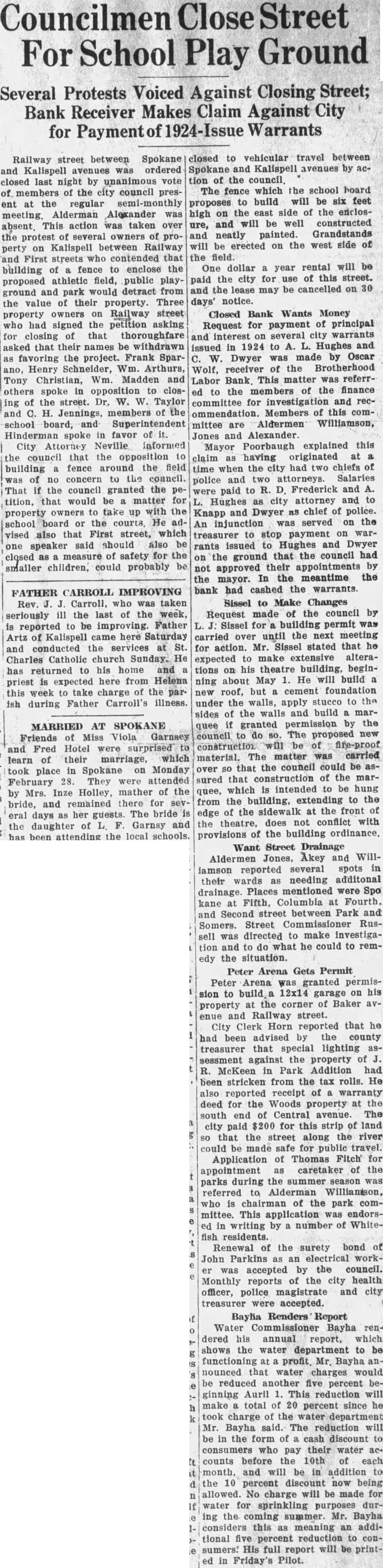 Councilmen For School Play Ground Several Protests Voiced Against Closing Street; Bank Receiver Makes Claim Against City for Warrants Railway street between Spokane and Kalispell avenues was ordered last night by unanimous vote of members of the city council present at the regular meeting. Alderman Alexander was absent. This action was taken over the protest of several owners of proon Kalispell between Railway perty First streets who contended that building fence to enclose the proposed athletic field, public playground and park would detract from the value of their property. Three owners on street property who had signed the asking for closing of that thoroughfare asked that their names be withdrawn as favoring the project. Frank ano, Henry Schneider, Wm. Arthurs, Tony Christian, Wm. Madden and others spoke in opposition to closing of the street. W. W. Taylor and H. Jennings, members of the school board, and Superintendent Hinderman spoke in favor of it. City Attorney Neville informed the council that the opposition to building fence around the field of concern to the council. no That if the council granted the tition, that would be matter for to take with the property owners up school board the He ador vised also that First street, which said should also be one speaker measure of safety for the closed as smaller children, could probably to vehicular travel between closed Spokane and Kalispell avenues by action of the The fence which the school board to build will be six feet proposes the east side of the encloshigh on and will be well constructed ure, neatly painted. Grandstands and be erected on the west side of will the field. One dollar year rental will be paid the city for use of this street. and the lease may be cancelled on 30 days' notice. Closed Bank Wants Money Request for payment of principal several city warrants and interest on issued in 1924 to L. Hughes and was made by Oscar W. Dwyer receiver of the Brotherhood Wolf, This matter was referrLabor Bank the members of the finance to committee for investigation and recommendation. Members of this committee Aldermen Williamson, are Jones and Alexander. Mayor Poorbaugh explained this claim as having originated at the city had two chiefs of time when attorneys. Salaries police and two R. Frederick and were paid to Hughes as city attorney and to Knapp and Dwyer as chief of police. An injunction was served on the treasurer to stop payment on warissued to Hughes and Dwyer rants that the council had on the ground not approved their appointments by the mayor. In the meantime the bank had cashed the warrants. Sissel to Make Changes Request made of the council by Sissel for building permit was carried until the next meeting over Mr. Sissel stated that he for action. expected to make extensive alterations on his theatre building, beginabout May He will build ning but cement foundation new roof, under the walls, apply stucco to the sides of the walls and build marquee if granted permission by the council to do so. The proposed new construction will fire-proof matter was carried material. The the council could be asover that sured that construction of the marquee, which is intended be hung from the building, extending to the edge of the sidewalk at the front of theatre, does not conflict with the provisions of the building ordinance. Want Street Drainage Aldermen Jones, Akey and Willseveral spots in iamson reported their wards as needing additonal drainage. Places mentioned were Spo kane at Fifth, Columbia at Fourth. and Second street between Park and Somers. Street Commissioner Russell was directed to make investigation and to do what he could to remthe situation. edy Peter Arena Gets Permit Peter Arena was granted permission to build 12x14 garage on his at the corner of Baker property enue and Railway street. City Clerk Horn reported that he been advised by the county had treasurer that special lighting assessment against the property of McKeen in Park Addition had been stricken from the tax rolls. He also reported receipt of warranty deed for the Woods property at the south end of Central avenue. The city paid $200 for this strip of land that the street along the river could be made safe for public travel. Application of Thomas Fitch for appointment as caretaker of the parks during the summer season was referred to Alderman Williamson, who is chairman of the park committee. This application was endorsin writing by number of Whitefish residents. Renewal of the surety bond of John Parkins as an electrical workwas accepted by the council. Monthly reports of the city health officer, police magistrate and city treasurer were accepted. Bayha Renders Report Water Commissioner Bayha rendered his annual report, which shows the water department to be functioning profit. Mr. Bayha announced that water charges would be reduced another five percent beginning Auril This reduction will make total of 20 percent since he took charge of the Mr. Bayha said. The reduction will be in the form of cash discount to consumers who pay their water ac+ counts before the 10th of each month, and will be addition to the 10 percent discount now being allowed. No charge will be made for water for sprinkling purposes during the coming summer. Mr. Bayha considers this as meaning an additional five percent reduction to consumers: His full report will printin Friday's Pilot.
