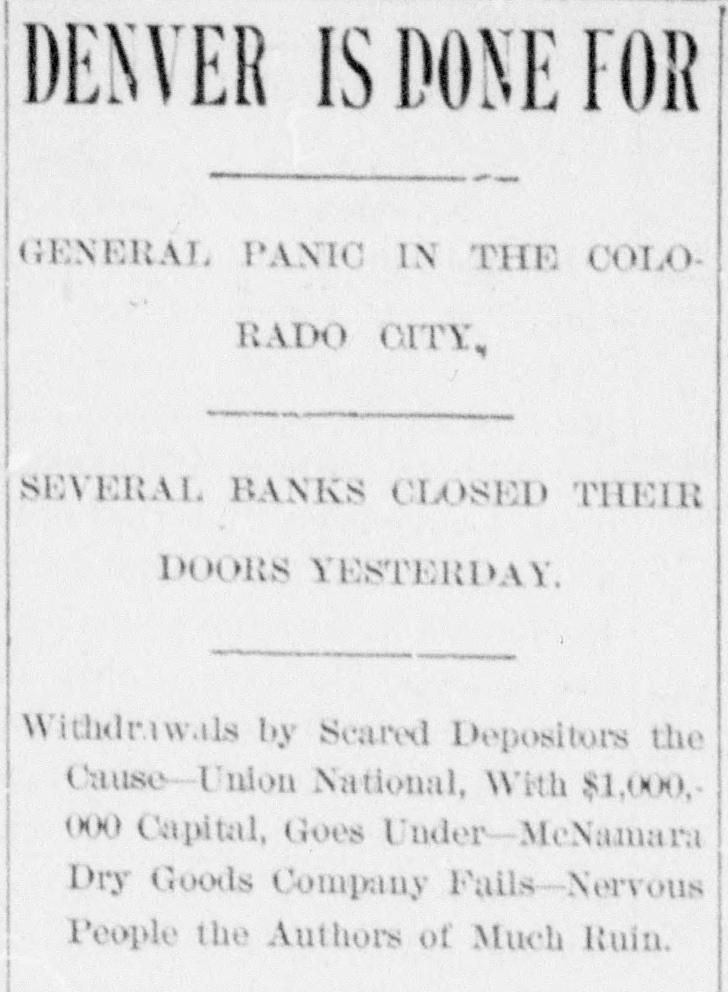 Denver has had a panic its banks being besieged by clamorous depositors. Asa result the Union National with a capital of a million dollars went down, quicklv followed by five others. Over 8,000,000 had been withdrawn from these banks in the past eight months, and they were in poor condition to stand a run.