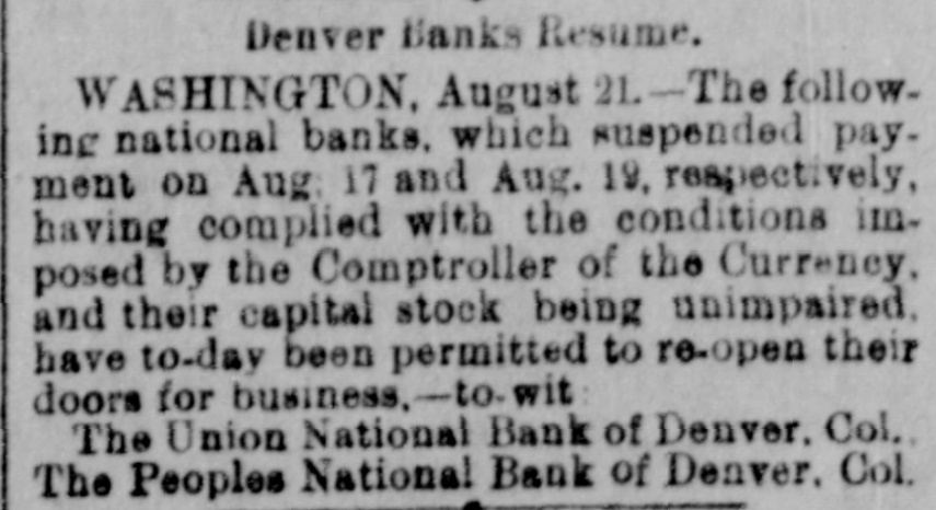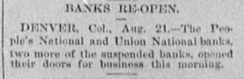 The Union National Bank of Denver, Col. ... have to-day been permitted to re-open their doors for business. (Aug. 21, 1893 notices).