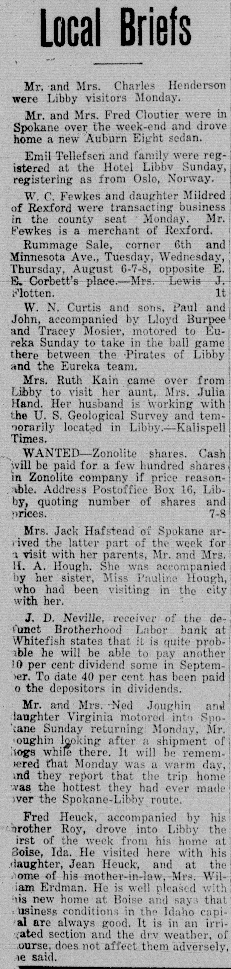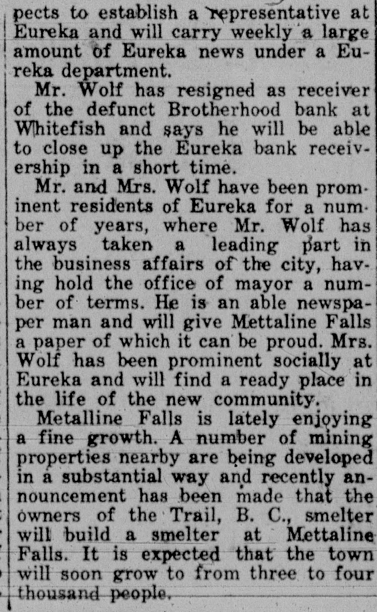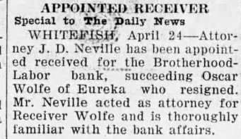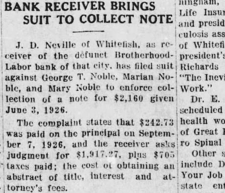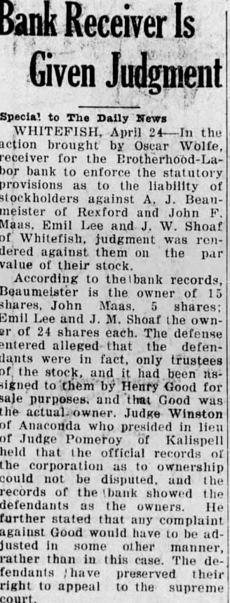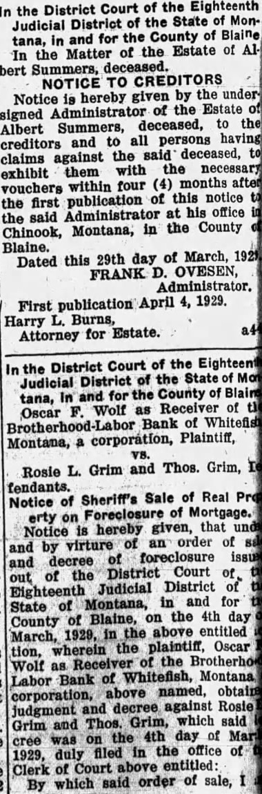 In the District Court of the Eighteenth Judicial District of the State of Montana, in and for the County of Blaine In the Matter of the Estate of Albert Summers, deceased. NOTICE TO CREDITORS Notice is hereby given by the undersigned Administrator of the Estate of Albert Summers, deceased, to the creditors and to all persons having claims against the said deceased, to exhibit them with the necessary vouchers within four (4) months after the first publication of this notice to the said Administrator at his office in Chinook, Montana, in the County of Blaine. Dated this 29th day of March, 1921 FRANK D. OVESEN, Administrator. First publication April 4, 1929. Harry L. Burns, Attorney for Estate. In the District Court of the Eighteent Judicial District of the State of Mon tana, in and for the County of Blain Oscar F. Wolf as Receiver of the Brotherhood Bank of Whitefist Montana, a corporation, Plaintiff, Rosie L. Grim and Thos. Grim, I fendants. Notice of Sheriff's Sale of Real Pro erty on Foreclosure of Mortgage. Notice is hereby given, that unds and by virture of an order of and decree of foreclosure issue out of the District Court of. Eighteenth Judicial District of State of Montana, in and for County of Blaine, on the 4th day March, 1929, in the above entitled tion, wherein the plaintiff, Oscar Wolf as Receiver of the Brotherho Labor Bank of Whitefish, Montana corporation, above named, obtaine judgment and decree against Rosie Grim and Thos. Grim, which said cree was on the 4th day of Mar 1929, duly filed in the office of Clerk of Court above entitled: By which said order of sale,