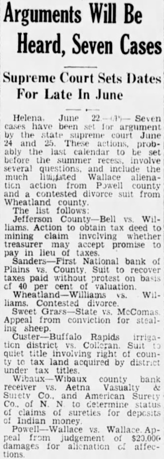 Arguments Will Be Heard, Seven Cases Supreme Court Sets Dates For Late In June June 22 Seven cases have been set for argument the supreme June and These probably the last to be before the several questions, and include the much liuislated Wallace alienation action from Powell county and contested divorce from Wheatland county The follows Jefferson VS. Williams. Action to obtain deed to mining claim involving whether treasurer may accept promise to pay in First National bank of Plains VS. County Suit to recover taxes paid without protest on basis of 40 per cent valuation vs. Williams. Contested divorce Sweet McComas Appeal from conviction for stealing sheep Rapids irrigation district Colleran quiet title of county tax land acquired by district under tax titles Wibaux- Wibaux county bank receiver Aetna Vasualty & Surety Co. and American Surety Co. determine status claims of sureties for deposits Indian money Wallace Wallace Appeal from judgement $20,000 damages for alienation of affections