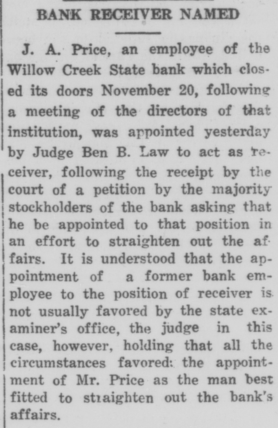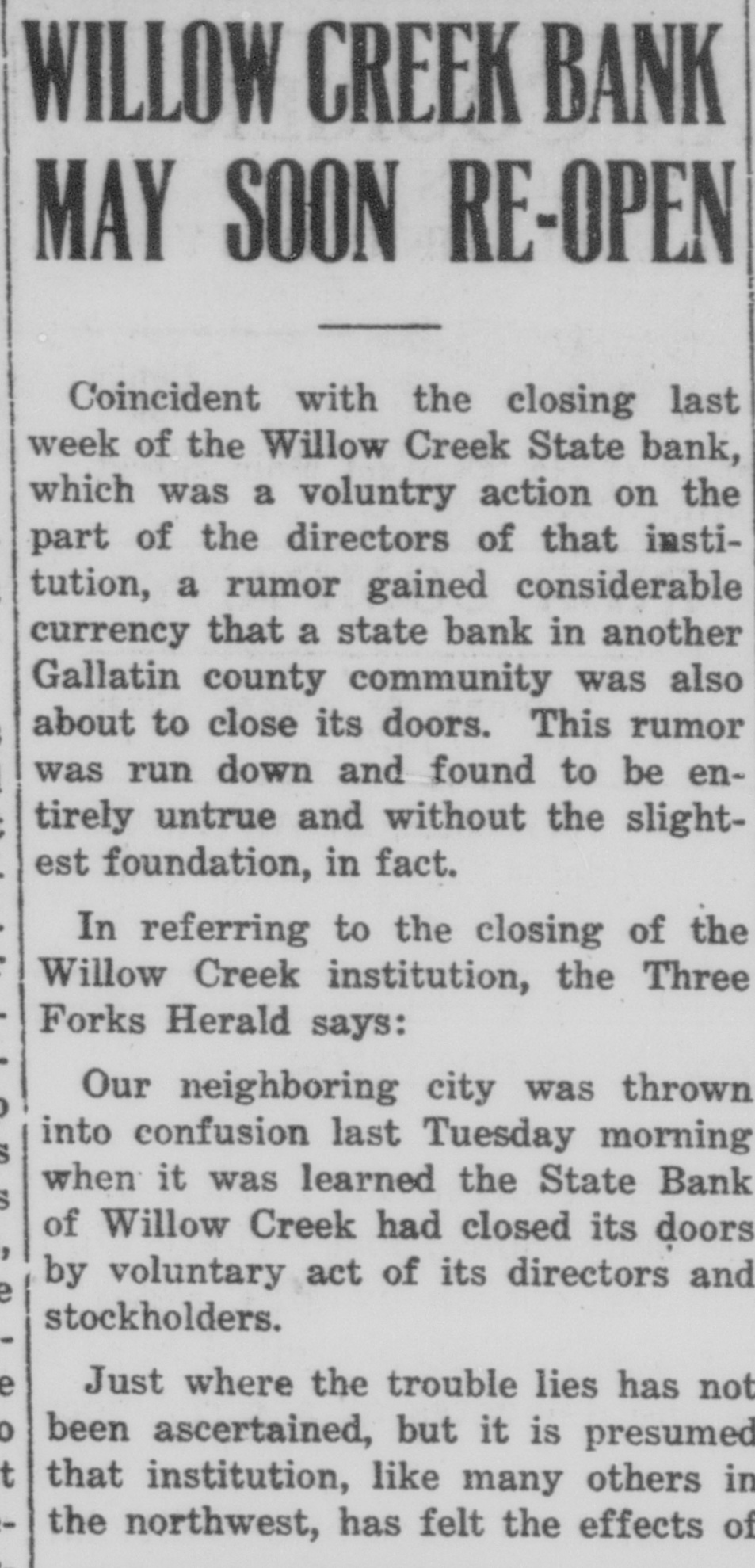 WILLOW CREEK BANK MAY SOON RE-OPEN Coincident with the closing last week of the Willow Creek State bank, which was a voluntry action on the part of the directors of that institution, a rumor gained considerable currency that a state bank in another Gallatin county community was also about to close its doors. This rumor was run down and found to be entirely untrue and without the slightest foundation, in fact. In referring to the closing of the Willow Creek institution, the Three Forks Herald says: Our neighboring city was thrown into confusion last Tuesday morning when it was learned the State Bank of Willow Creek had closed its doors by voluntary act of its directors and stockholders. Just where the trouble lies has not been ascertained, but it is presumed that institution, like many others in the northwest, has felt the effects of