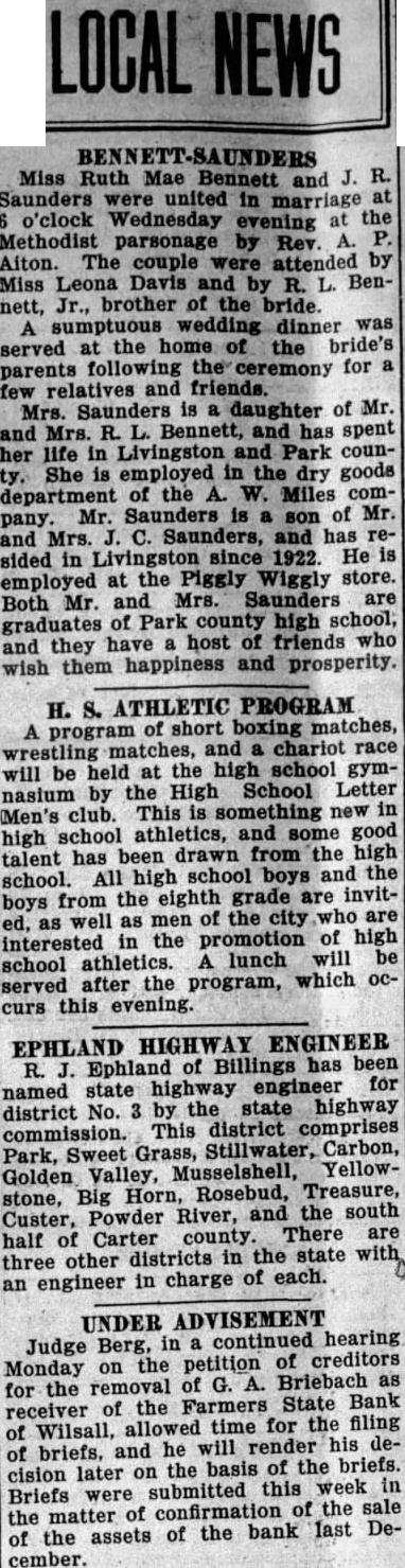 LOCAL NEWS BENNETT-SAUNDERS Miss Ruth Mae Bennett and J. R. Saunders were united in marriage at 6 o'clock Wednesday evening at the Methodist parsonage by Rev. A. P. Aiton. The couple were attended by Miss Leona Davis and by R. L. Bennett, Jr., brother of the bride. A sumptuous wedding dinner was served at the home of the bride's parents following the ceremony for a few relatives and friends. Mrs. Saunders is a daughter of Mr. and Mrs. R. L. Bennett, and has spent her life in Livingston and Park county. She is employed in the dry goods department of the A. W. Miles company. Mr. Saunders is a son of Mr. and Mrs. J. C. Saunders, and has resided in Livingston since 1922. He is employed at the Piggly Wiggly store. Both Mr. and Mrs. Saunders are graduates of Park county high school, and they have a host of friends who wish them happiness and prosperity. H. S. ATHLETIC PROGRAM A program of short boxing matches, wrestling matches, and a chariot race will be held at the high school gymnasium by the High School Letter Men's club. This is something new in high school athletics, and some good talent has been drawn from the high school. All high school boys and the boys from the eighth grade are invited, as well as men of the city who are interested in the promotion of high school athletics. A lunch will be served after the program, which occurs this evening. EPHLAND HIGHWAY ENGINEER R. J. Ephland of Billings has been named state highway engineer for district No. 3 by the state highway commission. This district comprises Park, Sweet Grass, Stillwater, Carbon, Golden Valley, Musselshell, Yellowstone, Big Horn, Rosebud, Treasure, Custer, Powder River, and the south half of Carter county. There are three other districts in the state with an engineer in charge of each. UNDER ADVISEMENT Judge Berg, in a continued hearing Monday on the petition of creditors for the removal of G. A. Briebach as receiver of the Farmers State Bank of Wilsall, allowed time for the filing of briefs, and he will render his decision later on the basis of the briefs. Briefs were submitted this week in the matter of confirmation of the sale of the assets of the bank last December.