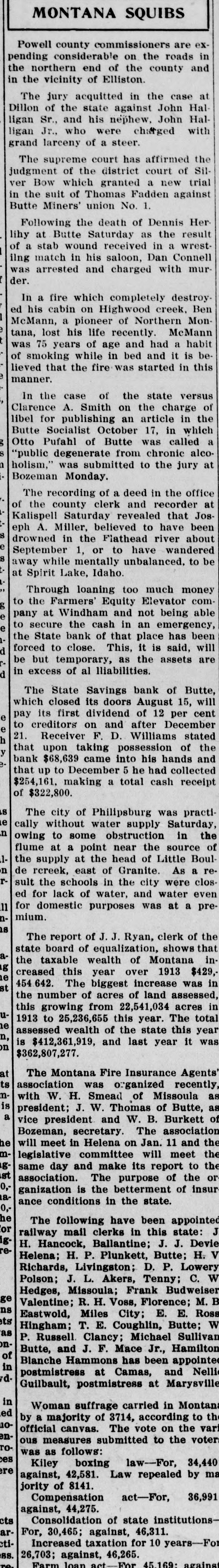 montana SQUIBS Powell county commissioners are expending the considerable on the roads in in the northern end of the county and vicinity of Elliston. Dillon The jury acquitted in the case at ligan of the state against John Hal ligan Sr., and his nephew, John Halgrand Jr., who were charged with larceny of a steer. The supreme court has affirmed the judgment ver Bow of the district court of Silin the which granted a new trial Butte suit of Thomas Fadden against Miners' union No. 1. Following the death of Dennis Herof lihy a at Butte Saturday as the result ilng stab wound received in a wrestwas match in his saloon, Dan Connell der. arrested and charged with murIn his a fire which completely destroy. ed McMann, cabin on Highwood creek, Ben tana, a pioneer of Northern Mon was 75 lost his life recently. McMann of years of age and had a habit lieved smoking while in bed and it is bemanner. that the fire was started in this In the case of the state versus libel Clarence A. Smith on the charge Butte for publishing an article in of Otto Socialist October 17, in which the "public Pufahl of Butte was called holism," degenerate from chronic alco- a Bozeman was Monday. submitted to the jury at The the recording of a deed in the office of county clerk and recorder Kalispell eph A. Saturday revealed that Jos at drowned Miller, believed to have been September in the Flathead river about away while 1, or to have wandered at Spirit Lake, mentally Idaho. unbalanced, to be Through the loaning too much money to pany Farmers' Equity Elevator com to secure at Windham and not being able the the cash in an emergency forced State bank of that place has been d be but to close. This, it is said, will in temporary, as the assets are d excess of al Iliabilities. which The State Savings bank of Butte, pay its closed its doors August 15, will e to creditors first dividend of 12 per cent e 21. on and after December h that Receiver F. D. Williams stated y bank upon taking possession of the that $68,639 came into his hands $254,161. up to December 5 he had collected and of $322,800. making a total cash receipt S e cally The city of Philipsburg was practin owing without water supply Saturday flume to some obstruction in the 1the at a point near the source of n de supply at the head of Little Boul rsult rcreek, the east of Granite. As a ed for schools in the city were clos re11 for lack of water, and water even P. mium. domestic purposes was at a pre is The report of J. J. Ryan, clerk of the astate the board of equalization, shows that g creased taxable wealth of Montana e 454.642. this year over 1913 $429, in st the The biggest increase was in this number of acres of land assessed -n1913 growing from 22,541,034 acres in he to 25,236,655 this year. The total n, assessed is wealth of the state this on $362,807,277. $412,361,919, and last year it year was at ts The Montana Fire Insurance Agents nassociation with W. was organized recently H. Smead of Missoula is a president; vice J. W. Thomas of Butte, as president and W. B. Burkett as he Bozeman, will secretary. The association o mmeet in Helena on Jan. 11 and the glegislative committee will meet the st same day and make its report to the 0,association. The purpose of the aganization is the betterment of insur or 0,ance conditions in the state. he or The following have been appointed 1grailway H. mail clerks in this state: reHancock, Ballantine; J. J. Devie J Helena; H. P. Plunkett, Butte; H. V Richards, Livingston; D. P. Lowery Polson; J. L. Akers, Tenny; C. ge Hedges, Missoula; Frank Budweiser W ns Valentine; R. H. Voss, Florence; M. B ets Eastwold, Miles City; E. E. Ross as Hingham; P. T. E. Coughlin, Butte; onRussell. Clancy; Michael Sullivan W of Butte, and J. F. Mace Jr., Hamilton in Blanche Hammons has been appointed dpostmistress at Camas, and Nelli Guilbault, postmistress at Marysville in ed Woman a suffrage carried in Montana uoby majority of 3714, according to the enofficial canvas. The vote on the roous measures submitted to the voter vari was as follows: es ere Kiley boxing law-For, 34,440 against, 42,581. Law repealed by ma jority of 8141. Compensation act-For, 36,991 against, 44,275. cts Consolidation of state institutionsarFor, 30,465; against 46.311