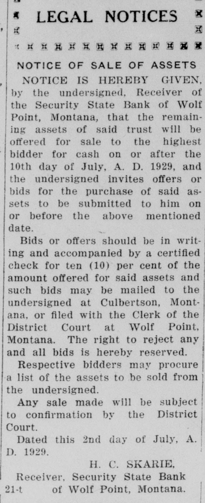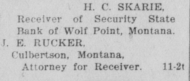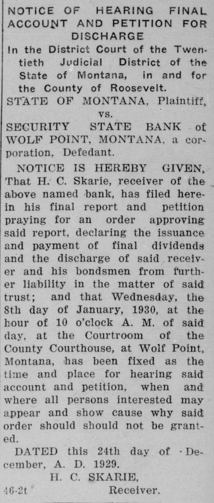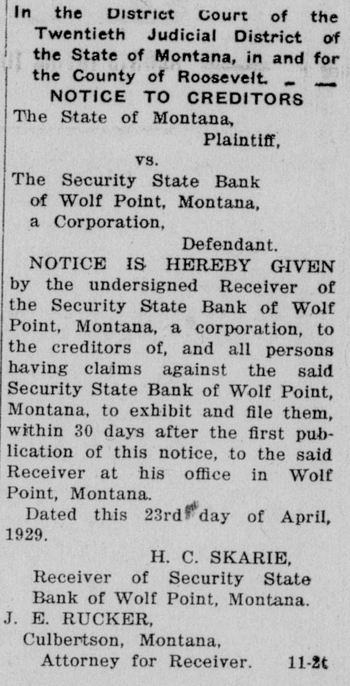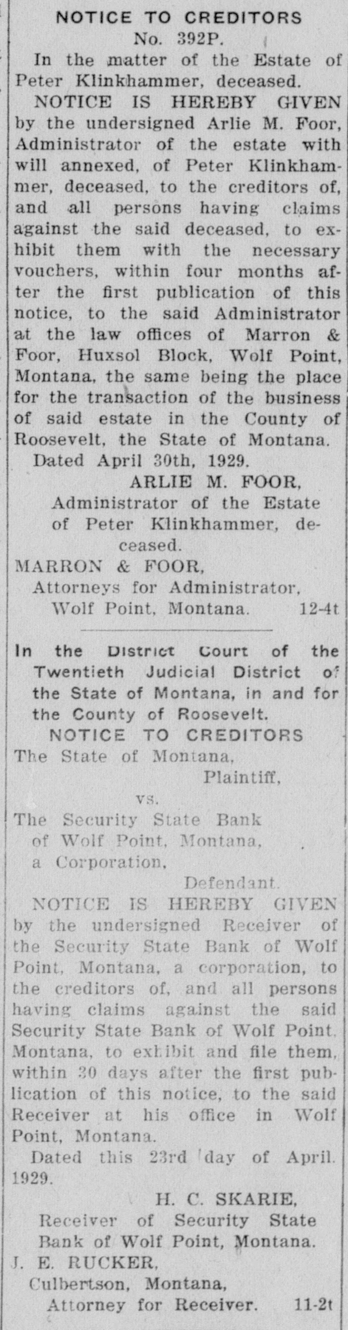 NOTICE TO CREDITORS No. 392P. In the matter of the Estate of Peter Klinkhammer, deceased. NOTICE IS HEREBY GIVEN by the undersigned Arlie M. Foor, Administrator of the estate with will annexed, of Peter Klinkhammer, deceased, to the creditors of, and all persons having claims against the said deceased, to exhibit them with the necessary vouchers, within four months after the first publication of this notice, to the said Administrator at the law offices of Marron & Foor, Huxsol Block, Wolf Point, Montana, the same being the place for the transaction of the business of said estate in the County of Roosevelt, the State of Montana. Dated April 30th, 1929. ARLIE M. FOOR, Administrator of the Estate of Peter Klinkhammer, deceased. MARRON & FOOR, Attorneys for Administrator, 12-4t Wolf Point, Montana. In the District Court of the Twentieth Judicial District of the State of Montana, in and for the County of Roosevelt. NOTICE TO CREDITORS The State of Montana, Plaintiff, vs. The Security State Bank of Wolf Point, Montana, a Corporation, Defendant. NOTICE IS HEREBY GIVEN by the undersigned Receiver of the Security State Bank of Wolf Point, Montana, a corporation, to the creditors of, and all persons having claims against the said Security State Bank of Wolf Point. Montana, to exhibit and file them, within 30 days after the first publication of this notice, to the said Receiver at his office in Wolf Point, Montana. Dated this 23rd day of April. 1929. H. C. SKARIE, Receiver of Security State Bank of Wolf Point, Montana. J. E. RUCKER, Culbertson, Montana, 11-2t Attorney for Receiver.