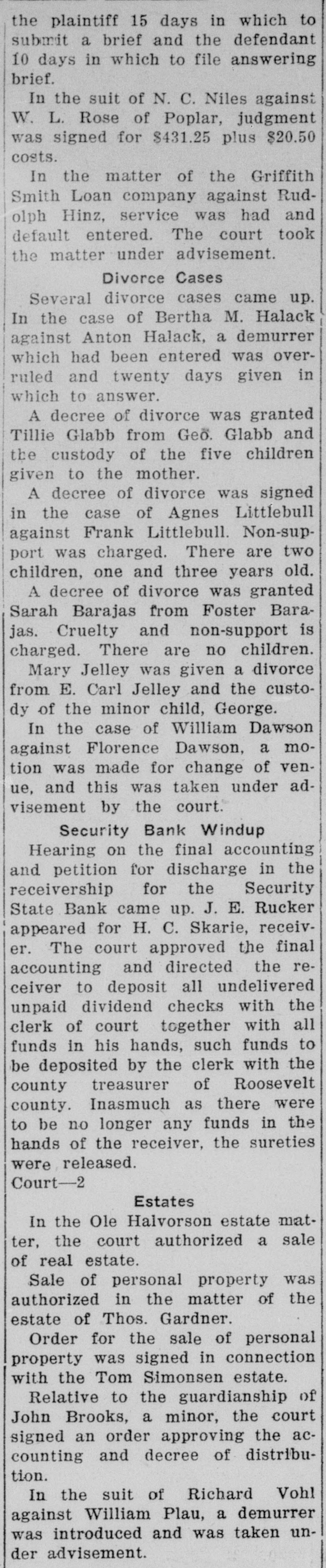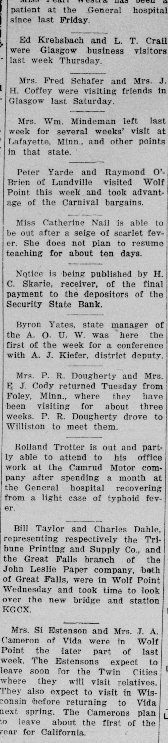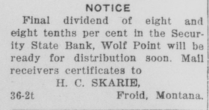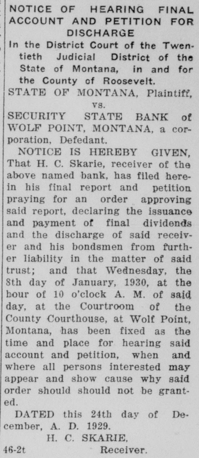 NOTICE TO CREDITORS No. 392P. In the matter of the Estate of Peter Klinkhammer, deceased. NOTICE IS HEREBY GIVEN by the undersigned Arlie M. Foor, Administrator of the estate with will annexed, of Peter Klinkhammer, deceased, to the creditors of, and all persons having claims against the said deceased, to exhibit them with the necessary vouchers, within four months after the first publication of this notice, to the said Administrator at the law offices of Marron & Foor, Huxsol Block, Wolf Point, Montana, the same being the place for the transaction of the business of said estate in the County of Roosevelt, the State of Montana. Dated April 30th, 1929. ARLIE M. FOOR, Administrator of the Estate of Peter Klinkhammer, deceased. MARRON & FOOR, Attorneys for Administrator, 12-4t Wolf Point, Montana. In the District Court of the Twentieth Judicial District of the State of Montana, in and for the County of Roosevelt. NOTICE TO CREDITORS The State of Montana, Plaintiff, vs. The Security State Bank of Wolf Point, Montana, a Corporation, Defendant. NOTICE IS HEREBY GIVEN by the undersigned Receiver of the Security State Bank of Wolf Point, Montana, a corporation, to the creditors of, and all persons having claims against the said Security State Bank of Wolf Point. Montana, to exhibit and file them, within 30 days after the first publication of this notice, to the said Receiver at his office in Wolf Point, Montana. Dated this 23rd day of April. 1929. H. C. SKARIE, Receiver of Security State Bank of Wolf Point, Montana. J. E. RUCKER, Culbertson, Montana, 11-2t Attorney for Receiver.