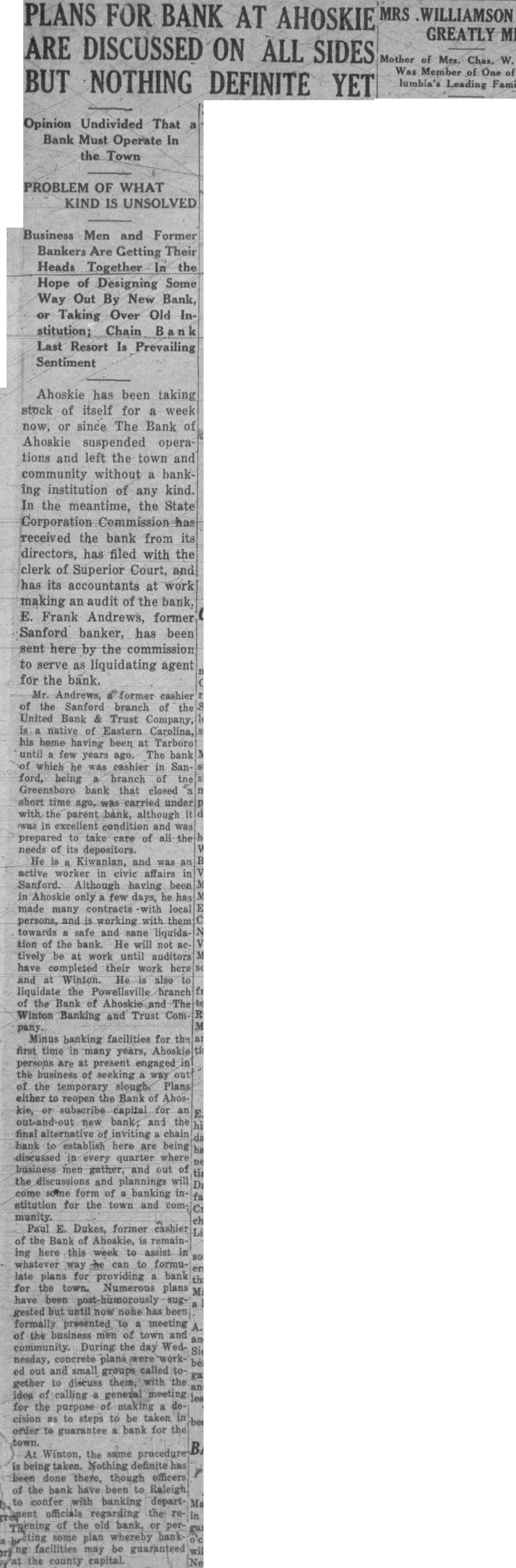 PLANS FOR BANK MRS WILLIAMSON AT AHOSKIE ARE DISCUSSED ON ALL SIDES Mother of Mrs. Chas. W. Was Member of One of CoBUT NOTHING DEFINITE YET lumbia's Leading Families Opinion Undivided That Bank Must Operate In the Town PROBLEM OF WHAT KIND IS UNSOLVED Business Men and Former Bankers Are Getting Their Heads Together In the Hope of Designing Some Way Out By New Bank, or Taking Over Old stitution; Chain Last Resort Is Prevailing Sentiment Ahoskie has been taking stock of itself for a week now, or since The Bank of Ahoskie suspended operations and left the town and community without a banking institution of any kind. In the meantime, the State Corporation Commission received the bank from its directors, has filed with the clerk of Superior Court, and has its accountants at work making an audit of the bank. E. Frank Andrews, former Sanford banker, has been sent here by the commission to serve as liquidating agent for the bank. Mr. Andrews, former cashier of the Sanford branch of the United Bank & Trust Company, native of Eastern Carolina, his home having been at Tarboro until few years The bank ago. of which he cashier in was ford, being branch of Greensboro bank that closed short time carried with the although was in excellent condition and was prepared to take care of all the needs of its depositors. He is Kiwanian, and was active worker in civic affairs Sanford. Although having been in Ahoskie only few days, he has made many contracts with local persons, and is working with them towards safe and sane liquidation of the bank. He will not tively be at work until auditors have completed their work and at Winton. He is also liquidate the Powellsville branch of the Bank of The Winton Banking and Trust ComMinus banking facilities for the first time in many years, Ahoskie persons are at present engaged in the business of seeking way out of the temporary slough. Plans either to reopen the Bank of Ahoskie, subscribe capital for out-and-out new bank; and the final alternative of inviting chain bank to establish here are being discussed in every quarter where business men gather, and out of the discussions and plannings will come some form of banking stitution for the town and munity. Paul E. Dukes, former cashier of the Bank of Ahoskie, is remaining here this week to assist son, whatever way can to formulate plans for providing bank for the town. Numerous plans have been suggested but until none has been formally presented to meeting of the business men of town and and community. During the day Wednesday, concrete ed and small groups called out to discuss them, with the gether and idea of calling general meeting less. for the purpose making cision to steps to be taken as order guarantee bank for town. At Winton, the same being taken. Nothing definite done there, though officers of the bank have been to Raleigh confer with banking departofficials regarding the of the old bank, persome plan whereby facilities may be guaranteed will the county capital. Next