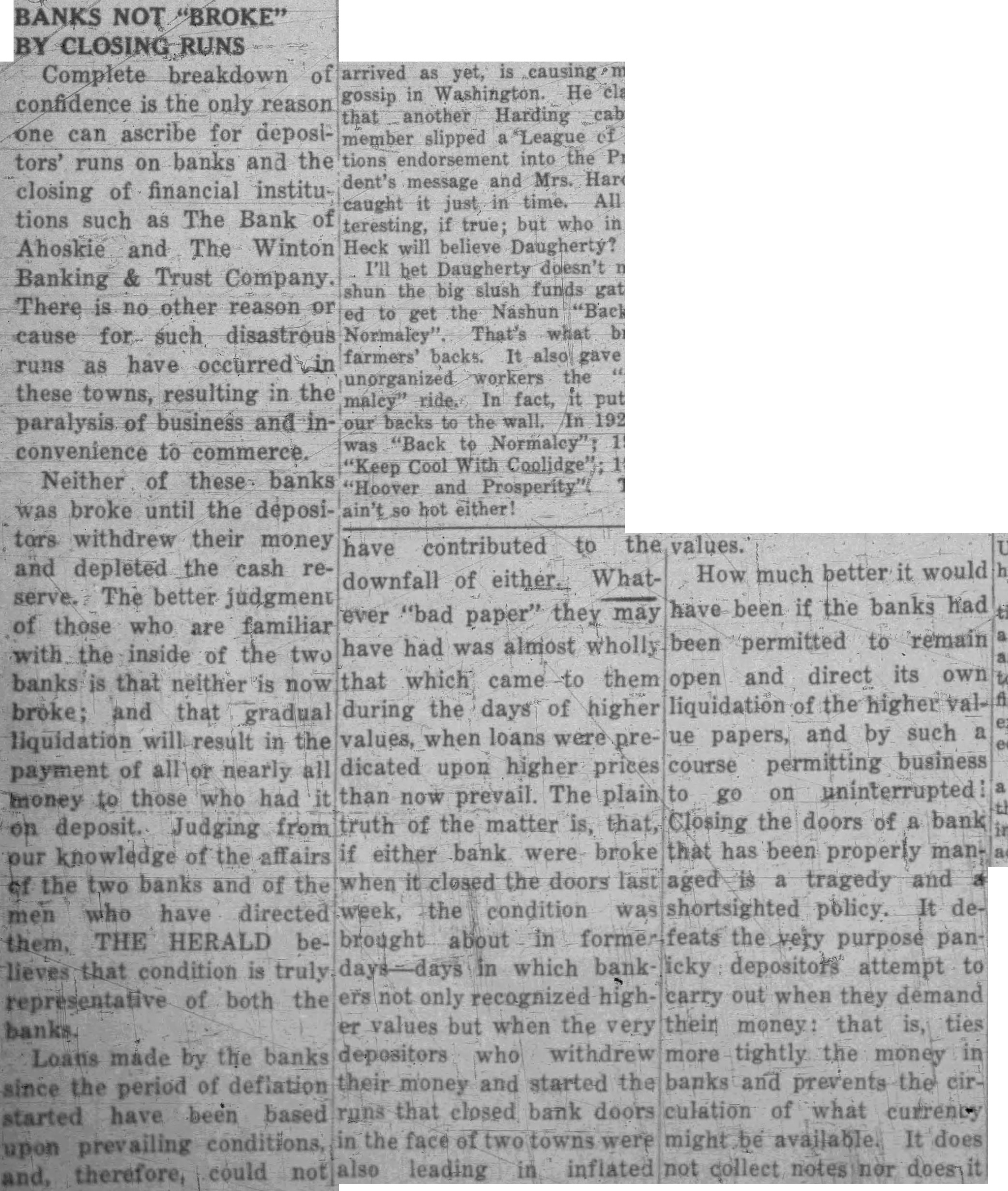 BANKS NOT "BROKE" BY CLOSING RUNS Complete breakdown of confidence is the only reason one can ascribe for depositors' runs on banks and the closing of financial institutions such as The Bank of Ahoskie and The Winton Banking & Trust Company. There is no other reason or cause for such disastrous runs as have occurred these towns, resulting in the paralysis of business and inconvenience to commerce. Neither of these banks was broke until the depositors withdrew their money and depleted the cash reserve. The better judgment of those who are familiar with the inside of the two banks is that neither is now broke; and that gradual liquidation will in the payment of all or nearly all money to those who had on deposit. Judging from our knowledge of the affairs of the two banks and of the men who have directed them. THE HERALD believes that condition is truly representative of both the banks. Loans made by the banks since the of deflation period started have been based conditions, upon prevailing could not and, therefore, have contributed to the values. How much better it would downfall of either. Whathave been if the banks had ever "bad paper" they may been permitted to remain have had was almost wholly that which came to them open and direct its own liquidation of the higher valduring the days of higher values, when loans were pre- ue papers, and by such a dicated upon higher prices course permitting business to go on uninterrupted than now prevail The plain truth of the matter is, that, Closing the doors of a bank if either bank were broke that has been properly manwhen it closed the doors is a tragedy and week, the condition shortsighted policy. It debrought about in former feats the very purpose panin which bank icky depositors attempt to ers not only recognized carry out when they demand er values but when the very their that is, ties money: depositors who withdrew more tightly the money in their and started the banks and prevents the money runs that closed bank doors culation of what currency in the face of be available. It does also leading in inflated ed