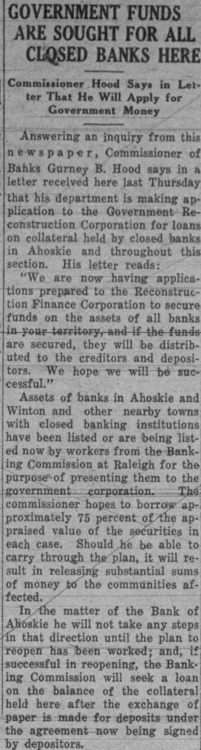 GOVERNMENT FUNDS ARE SOUGHT FOR ALL CLOSED BANKS HERE Commissioner Hood Says in Letter That He Will Apply for Government Money Answering an inquiry from this Commissioner Banks Gurney B. Hood says in letter received here last Thursday that his department is making plication to the Government construction Corporation for loans collateral held by closed banks Ahoskie and throughout this section. His letter reads: are now having applications prepared to the Reconstruction Finance Corporation to secure funds on the assets of all banks are secured, they will be distributed to the creditors and depositors. hope we will be cessful." Assets of banks in Ahoskie and Winton and other nearby towns with closed banking institutions have been listed or are being now by workers from the Commission at Raleigh for the purpose presenting them to the commissioner hopes to borrow proximately 75 percent of the praised value of the securities each case. Should he be able carry through the plan, it will sult in releasing substantial of money to the communities fected. In the matter of the Bank Ahoskie he will not take steps any that direction until the plan reopen has been worked; and, successful in reopening, the Bank. ing Commission will seek loan the balance of the collateral held here after the exchange paper is made for deposits under agreement being signed depositors.