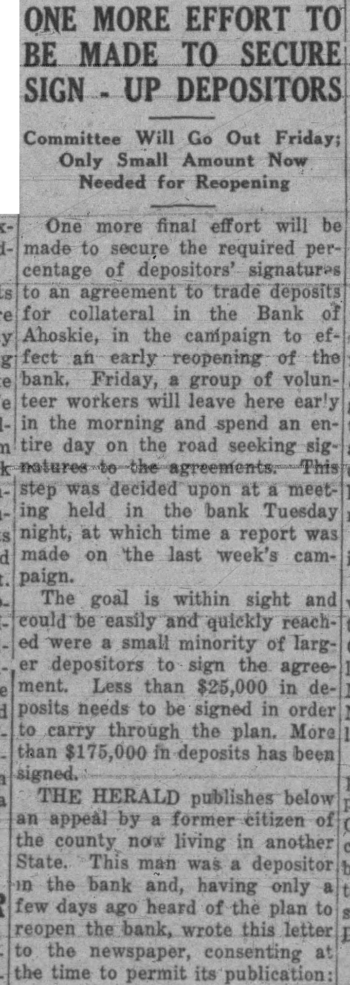 ONE MORE EFFORT TO BE MADE TO SECURE DEPOSITORS Committee Will Go Out Friday; Only Small Amount Now Needed for Reopening One more final effort will made to secure the required percentage of depositors' signatures an agreement to trade deposits for collateral in the Bank Ahoskie, in the campaign to fect an early reopening of bank. Friday, group of volunteer workers will leave here the morning and spend an tire day on the road seeking was decided upon at ing held in the bank Tuesday night, at which time report was made on the last week's campaign. The goal is within sight and could be easily and quickly were a small minority of depositors to sign the agreement. Less than $25,000 in posits needs to be signed in order carry through the plan. than in deposits has been signed. THE HERALD publishes below appeal by former citizen the county now living in another State. This man was depositor the bank and, having only few days ago heard of the plan reopen the bank, wrote this letter to the newspaper, consenting the time to permit its publication: