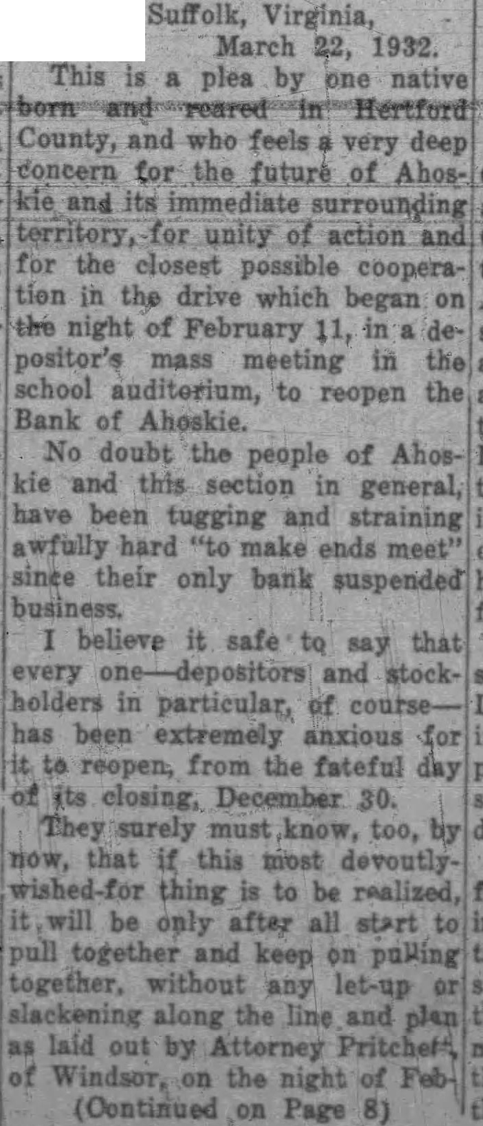 Suffolk, Virginia, March 22, 1932. This plea by one native County, and feels very deep concern for the future of and its immediate surrounding territory, for unity of action for the closest possible cooperation in the drive which began the night of February in positor's mass meeting in school to reopen Bank of Ahoskie. No doubt the people of Ahoskie and this section in general, have been tugging and straining awfully hard "to make ends their only bank suspended business. believe it safe say that every and stockholders in particular, of been extremely anxious reopen, from the fateful its closing, December 30. They surely must know, too, that this most thing to be realized, will be only after all start together and keep on pulling together, without let-up any slackening along the line and laid out by Attorney Windsor, the night on Page 8)