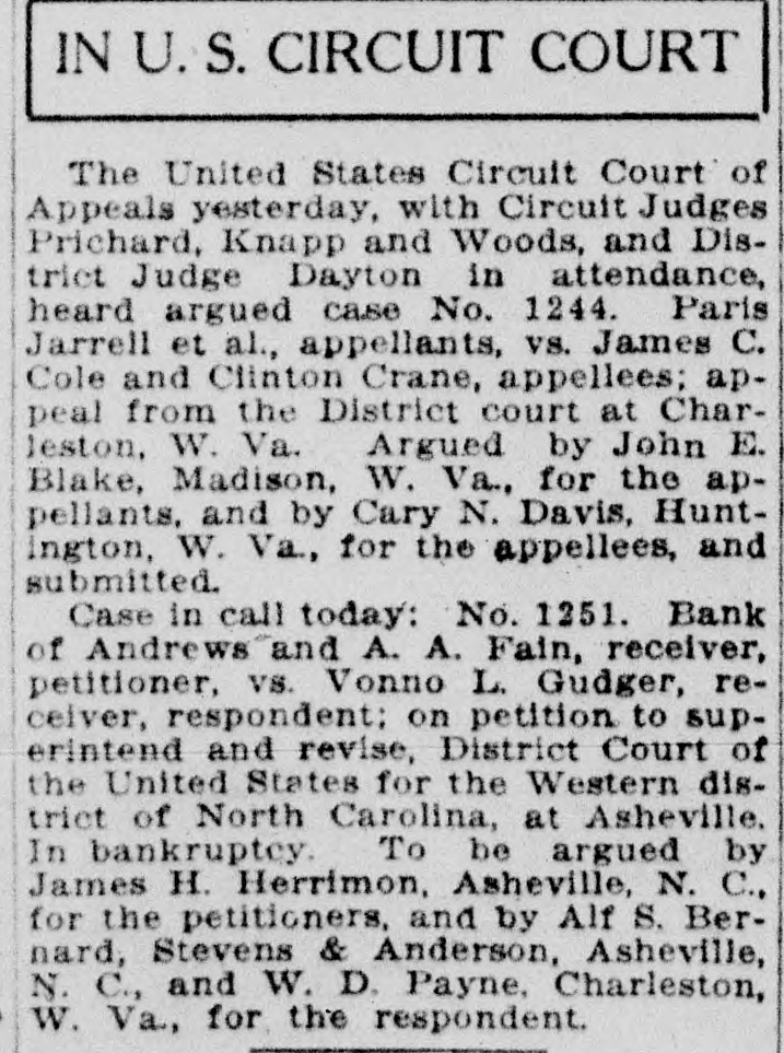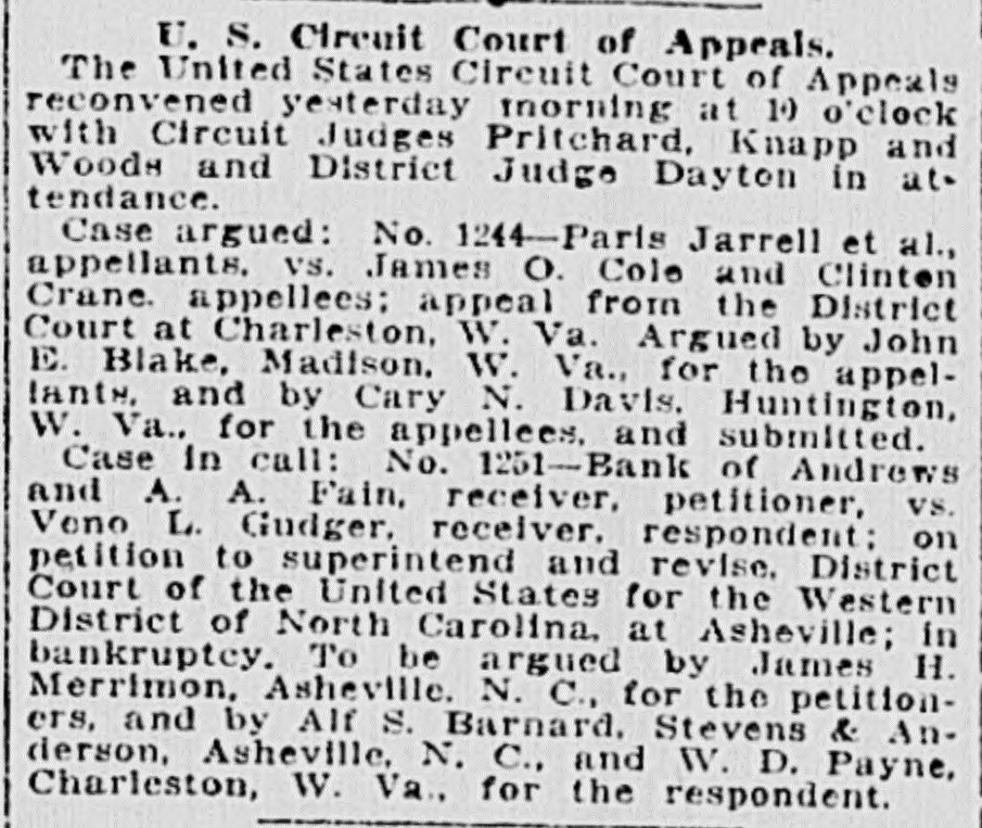 IN U.S. CIRCUIT COURT The United States Circuit Court of Appeals yesterday, with Circuit Judges Prichard, Knapp and Woods, and District Judge Dayton in attendance, heard argued case No. 1244. Paris Jarrell et al., appellants, vs. James C. Cole and Clinton Crane, appellees; appeal from the District court at Charleston, W. Va. Argued by John E. Blake, Madison, W. Va., for the appellants, and by Cary N. Davis, Huntington, W. Va., for the appellees, and submitted. Case in call today: No. 1251. Bank of Andrews and A. A. Fain, receiver, petitioner, vs. Vonno L. Gudger, receiver, respondent: on petition to superintend and revise, District Court of the United States for the Western district of North Carolina, at Asheville, In bankruptcy. To be argued by James H. Herrimon, Asheville, N. C., for the petitioners, and by Alf S. Bernard, Stevens & Anderson, Asheville, N. C., and W. D. Payne, Charleston, W. Va., for the respondent.