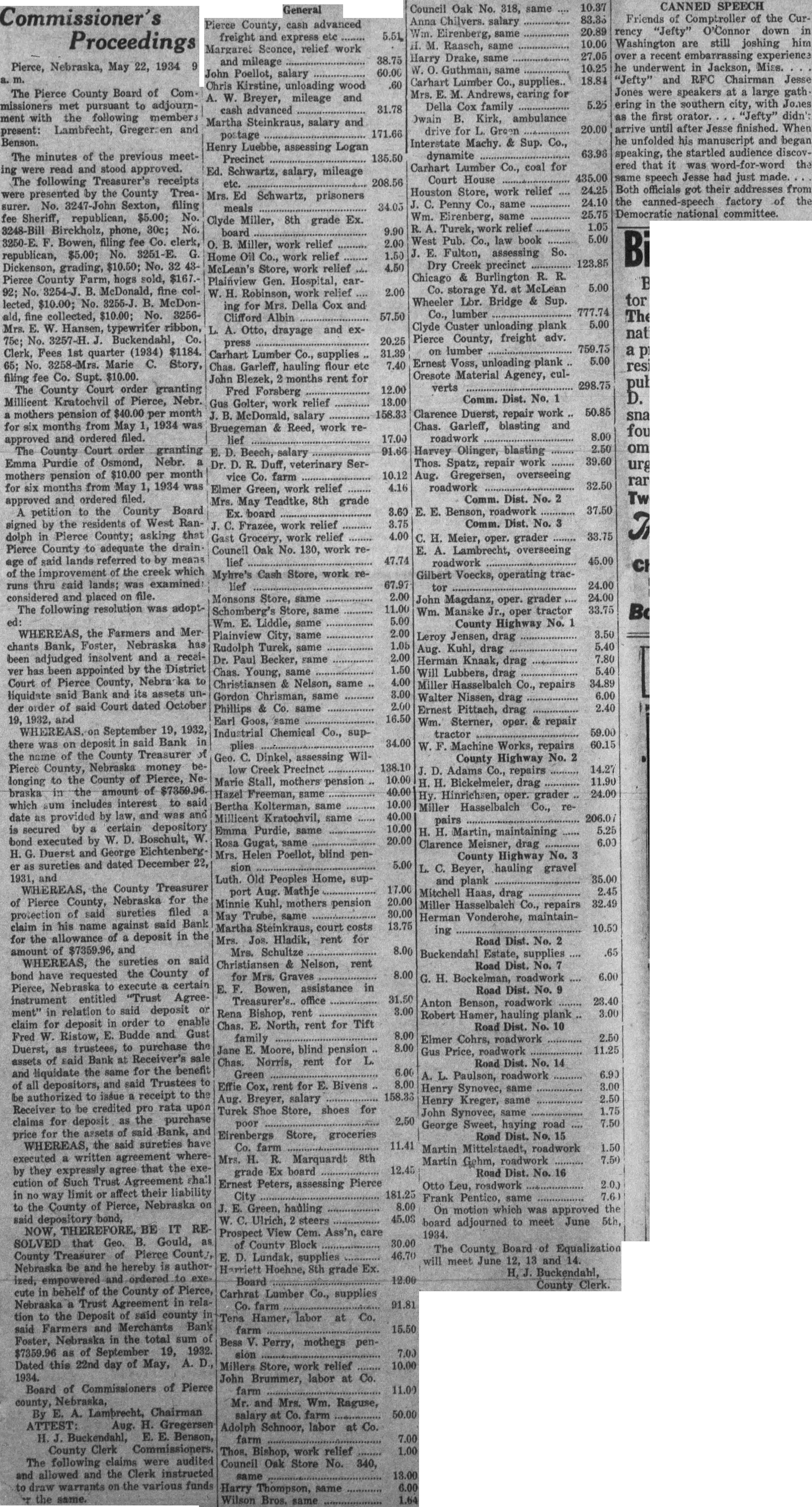 COMMISSIONERS' PROCEEDINGS Pierce, Nebr., May 22, 1934 The Pierce county board of commissioners met pursuant to adjourament with the following members present: Lambrecht, Gregersen and The minutes of the previous meeting were read and stood approved. The following treasurer's receipts were presented by the county treasurer. 3247-John Sexton, filing fee county sheriff, rep. $ 5.00 3248-Bill Birckholz, phone call .30 3249-Chas. Schlender, filing fee Co. Clk., rep. 5.00 3250-E. F. Bowen, filing fee Co. Clk., rep. 5.00 3251-E. G. Dickensen, grading 10.50 3252-Ed. Schwartz, filing fee Co. sheriff, dem. 5.00 3253-Pierce Co. Farm, hogs sold 167.92 10.00 3254-J. B. McDonald, fine collected 3255-J. B. McDonald, fine collected 10.00 3256-Mrs. E. W. Hansen, typewriter ribbon .75 3257-H. J. Buckendahl, Co. Clk., fees 1st quarter 1934 1184.65 3258-Mrs. Marie G. Story, filing fee, Co. Supt. 10.00 The county court order granting Millicent Kratochvil of Pierce, Nebraska, a mothers pension of $40 per month for six months from May 1, 1934, was approved and ordered filed. The county court order granting Emma Purdie of Osmond, Nebr., a mothers pension of $10.00 per month for six months from May 1, 1934, was approved and ordered filed. A petition to the county board signed by the residents of West Randolph in Pierce county asking that Pierce county make adequate the drainage of said lands referred to by means of the improvement of the creek which runs thru said lands was examined, considered and placed on file. The following resolution was adopted: WHEREAS, the Farmers & Merchants Bank, Foster, Nebr., has been adjudged insolvent and a receiver has been appointed by the district court of Pierce county, Nebraska, to liquidate said bank and its assets under order of said court dated October 19, 1932, and WHEREAS, on September 19, 1932 there was on deposit in said bank in the name of the county treasurer of Pierce county, Nebr., money belonging to the county of Pierce, Nebr., in the amount of $7,359.96, which sum includes interest to said date as provided by law, and was and is secured by a certain depository bond executed by W. D. Boschult, W. H. G. Duerst and George Eichberger as sureties and dated December 22, 1931 and WHEREAS, the county treasurer of Pierce county, Nebr., for the protection of said sureties filed a claim in his name against said bank for the allowance of a deposit in the amount of $7359.96, and WHEREAS, the sureties on said band have requested the county of Pierce, Nebr., to execute a certain instrument entitled "Trust Agreement" in relation to said deposit or claim for deposit in order to enable Fred W. Ristow, E. Budde and Gust Duerst, as trustees, to purchase the assets of said bank at Receiver's sale and liquidate the same for the benefit of all depositors, and said trustees to be authorized to issue a receipt to the Receiver to be credited pro rata upon claims for deposit as the purchase price for the assets of said bank, and WHEREAS, the said sureties have executed a written agreement whereby they expressly agree that the execution of such trust agreement shall in no way limit or affect their liability to the county of Pierce, Nebr., on said depository bond, NOW, THEREFORE, BE IT RESOLVED that Geo. B. Gould, as Co. Treasurer of Pierce county, Nebarska, be and he hereby is authorized, empowered and ordered to execute in behalf of the County of Pierce, Nebraska, a trust agreement in relation to the deposit of said county in said Farmers and Merchants Bank, Foster, Nebraska, in the total sum of $7359.96 as of September 19, 1932. Dated this 22nd day of May, A. D., 1934. ATTEST: H. J. Buckendahl, Co. Clk. BOARD OF COMMISSIONERS OF PIERCE COUNTY, NEBRASKA. By Lambrecht, Chairman Aug. Gregersen E. E. Benson, Commissioners. The following claims were audited and allowed and the clerk instructed to draw warrants on the various funds for the same. GENERAL Pierce Co., cash adv, frt. 5.51 Margaret Sconce, relief work and mileage 38.75 John Poellot, salary 60.00 Chris Kirstine, unloading wood .60 A. W. Breyer, mileage and cash advanced 31.78 Martha Steinkraus, salary and postage 171.66 Henry Luebbe, assessing Logan precinct 135.50 Ed. Schwartz, salary, mileage, etc. 208.56 Mrs. Ed. Schwartz, prisoners' meals 34.05 Clyde Miller, 8th grade exam. board 9.90 O. B. Miller, work relief 2.00 Home Oil Co., work relief 1.50 W. H. Robinson, work relief 2.00 McLean's Store, work relief 4.50 Plainview Gen. Hospital, caring for Mrs. Della Cox and Clifford Albin 57.50 L. A. Otto, drayage and express 20.25 Carhart Lumber Co., supplies 31.39 Chas. Garleff, hauling flour etc. 7.40 John Blezek, 2 mo. rent for Fred Forsberg 12.00 Gus Golter, work relief 13.00 J. B. McDonald, salary 158.33 Bruegman & Reed, work relief 17.00 E. D. Beech, salary 91.66 Dr. D. R. Duff, veterinary service at Co. farm 10.12 Elmer Green, work relief 4.16 Mrs. May Teadtke, 8th grade exam. board 3.60 J. C. Frazee, work relief 3.75 Gast Grocery, work relief 4.00 Council Oak No. 310, work relief 47.74 Myhre's Cash Store, work relief 67.97 Monson's Store, same 2.00 Schomberg,s Store, same 11.00 Wm. E. Liddle, same 5.00 Plainview City, same 2.00 Rudolph Turek, same 1.05 Dr. Paul Becker, same 2.00 Chas. Young, same 1.50 Christiansen & Nelson, same 4.00 Gordon Chrisman, same 3.00 Phillips & Co., same 2.00 Earl Goos, same 16.50 Industrial Chemical Co., supplies 34.00 Geo. C. Dinkel, assessing Willow Creek precinct 138.10 Marie Stall, mothers pension 10.00 Hazel Freeman, same 40.00 Bertha Kolterman, same 10.00 Millicent Kratochvil, same 40.00 Emma Purdie, same 10.00 Rosa Gugat, same 20.00 Mrs. Helen Poellot, blind pension 5.00 Luth. Old Peoples Home, support Aug. Mathje 17.00 Minnie Kuhl, mothers pension 20.00 May Trube, same 30.00 Martha Steinkraus, court costs 13.75 Mrs. Jos. Hladik, rent for Mrs. Schultze 8.00 Christiansen & Nelson, rent for Graves 8.00 E. F. Bowen, assistance in treasurer's office 31.50 Rena Bishop, rent 3.00 Chas. E. North, rent f